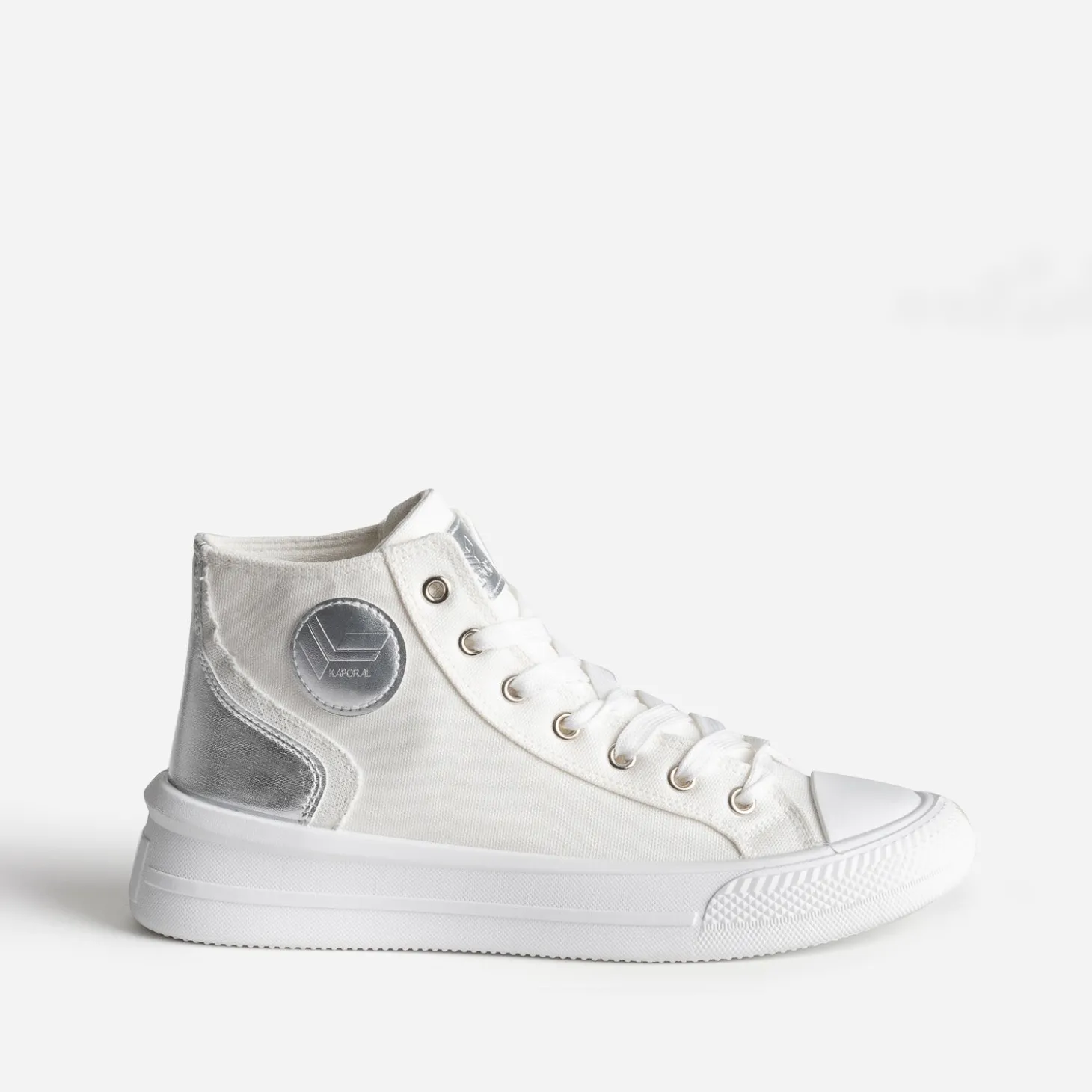 La basket en toile blanche conserve son statut de pièce mode estivale. Elle se démarque par des empiècements contrastés sur le contrefort, l’un métallisé argent, l’autre blanc, légèrement irisé. La semelle, légèrement compensée, apporte de la modernité, et le laçage, un effet monochrome. Imaginez-la avec un combi-short noir, avec un débardeur blanc et un jean cropped gris, avec une robe longue tube kaki.
