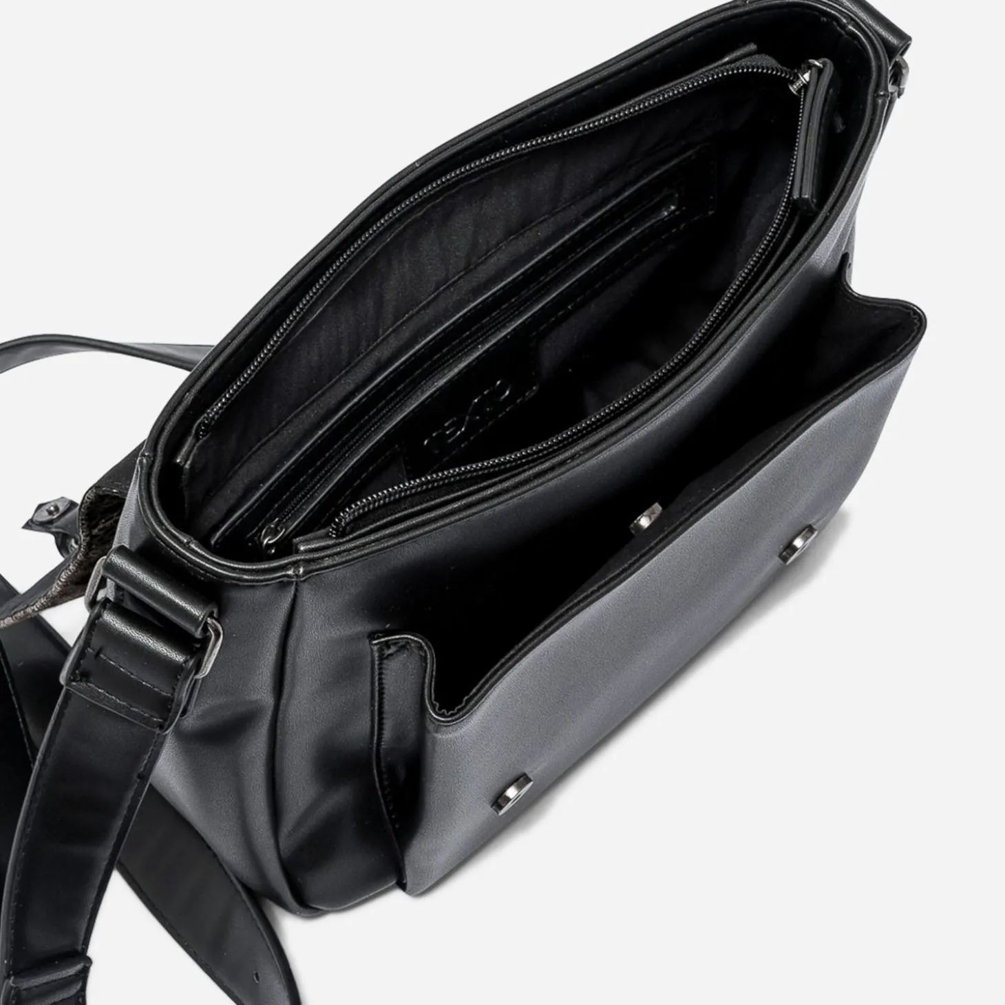 Fermeture par aimant et zip. 1 compartiment avec 2 poches dont 1 zippée. 2 poches externes dont 1 aimantée et 1 zippée. Bandoulière réglable non amovible.
