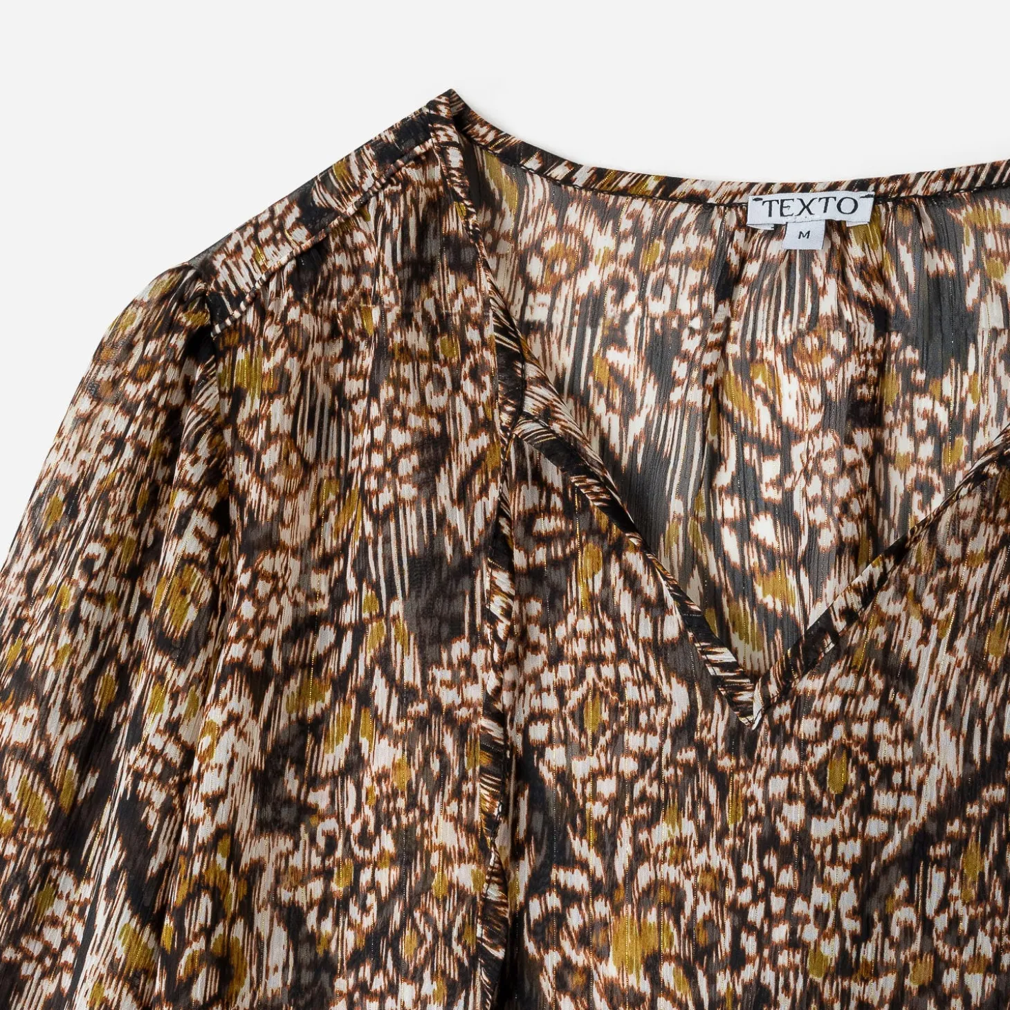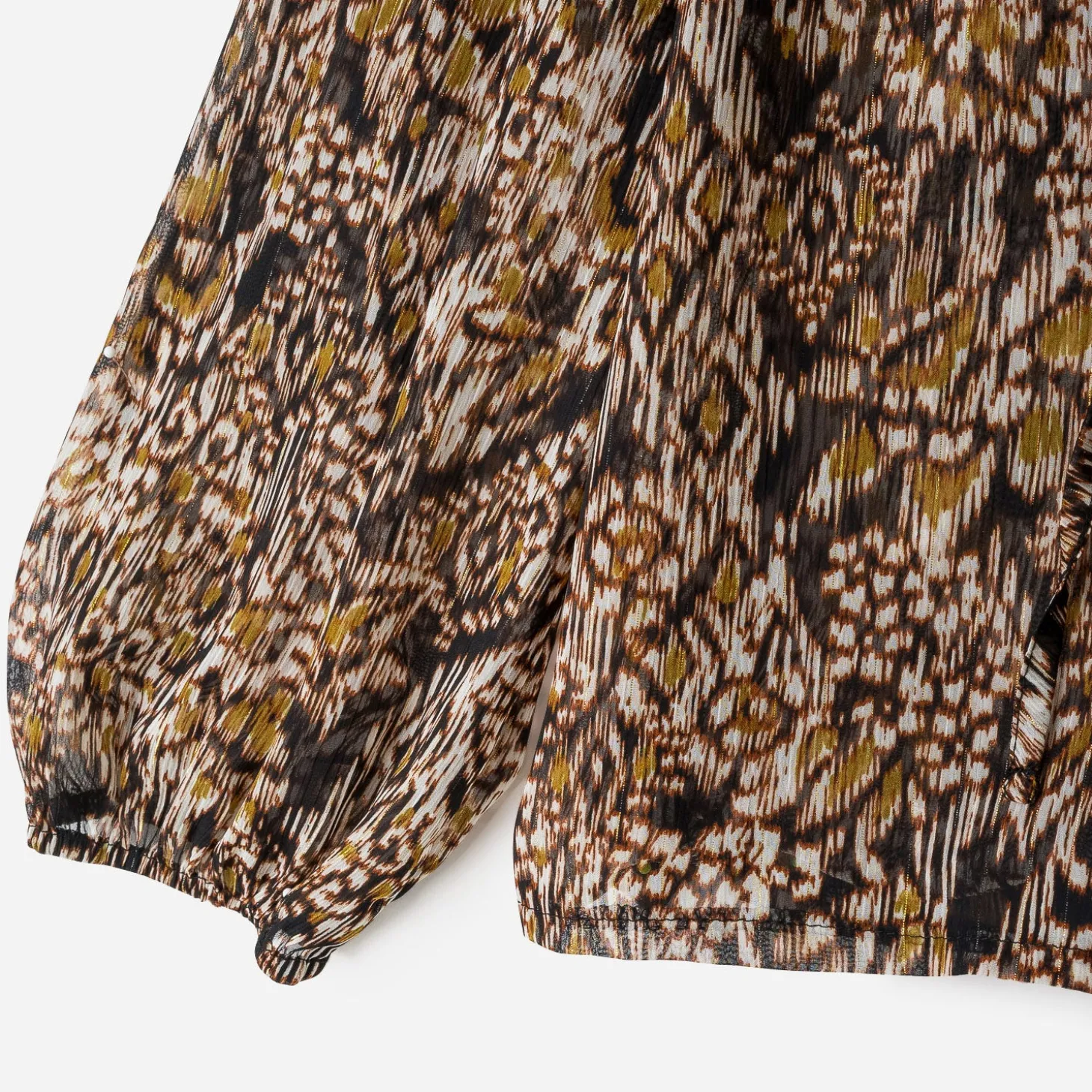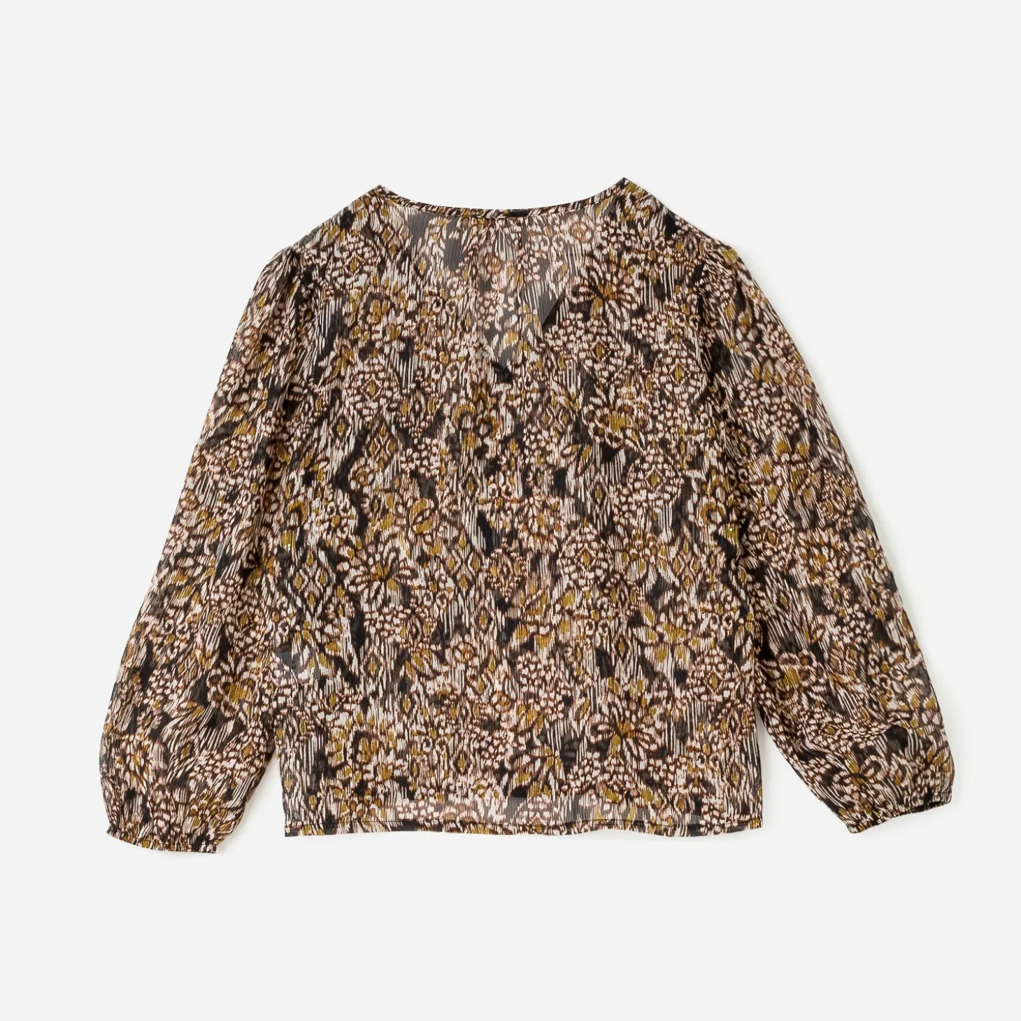 Une jolie blouse imprimée, c’est l’assurance d’un look facile à porter. En voile marron, elle se démarque par son imprimé ethnique floral, rehaussé de fines rayures dorées.