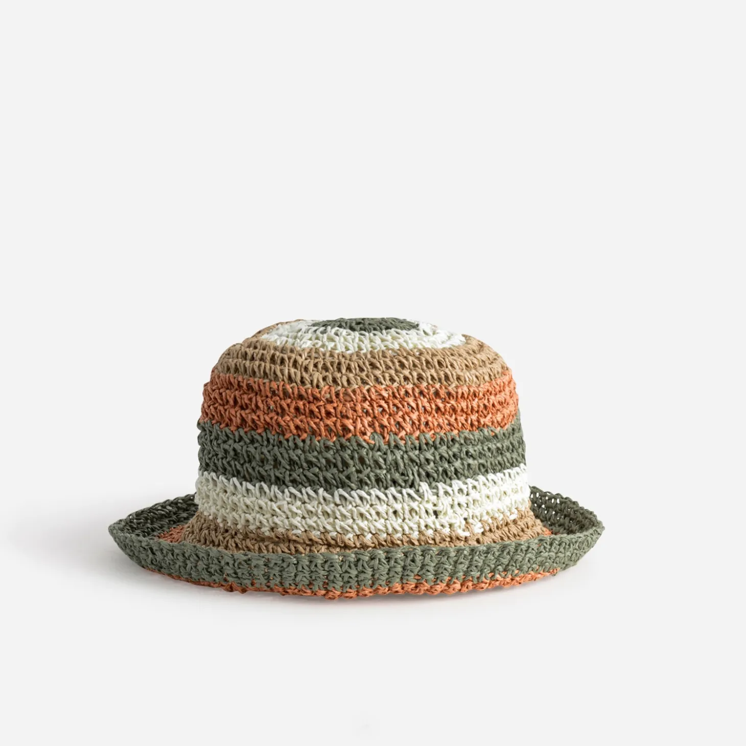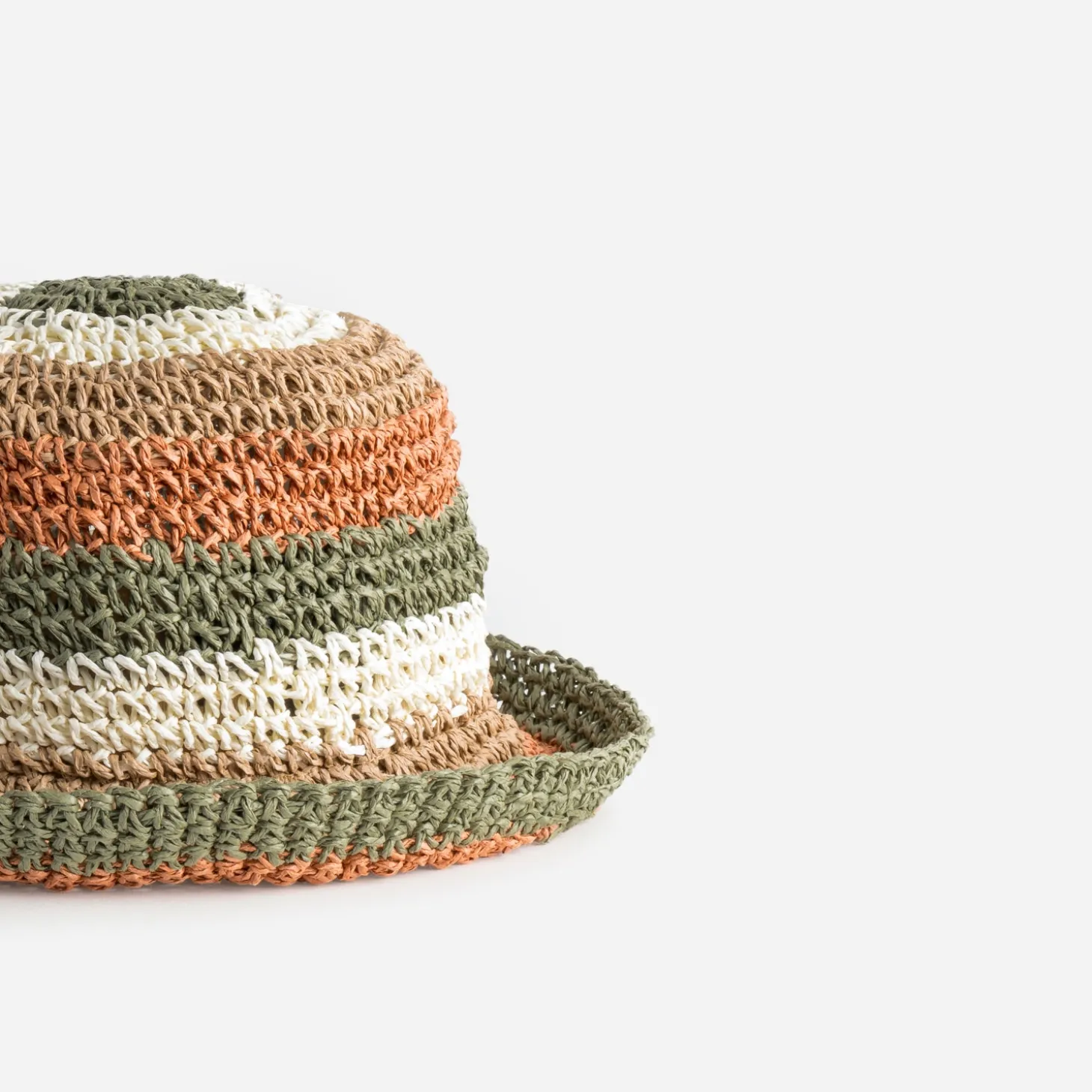 Le bob, c’est la forme de chapeau qui revient en tête… des tendances. D’origine sportswear, il est revisité par une paille papier tressée à motif rayures beiges, écrues, vertes et terracotta. Un accessoire qui défend un look décontracté, avec un débardeur kaki, une salopette short en jean blanc et des baskets montantes en toile beige.