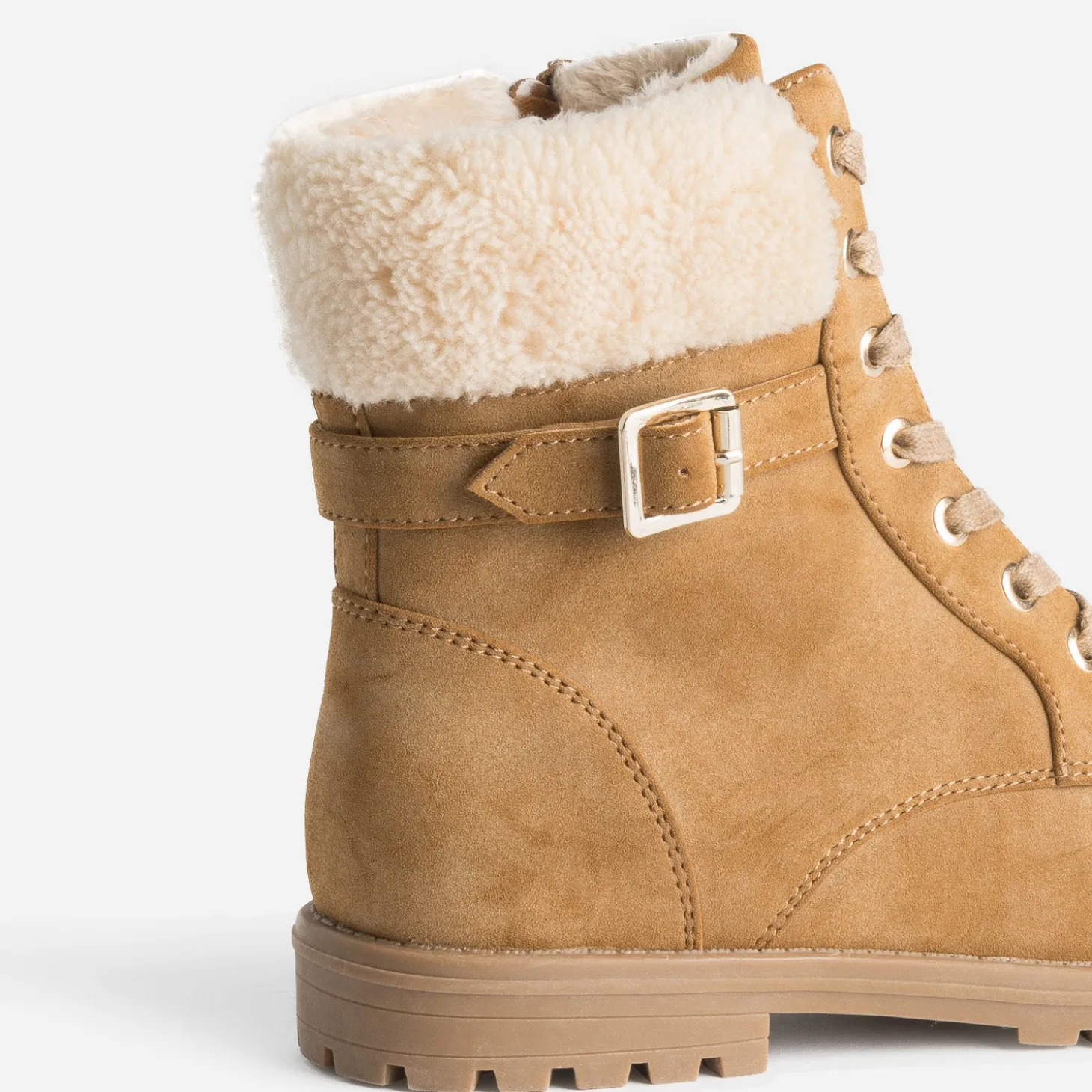 Plein hiver oblige, réchauffez les pieds de votre junior fille avec un boots adapté. En matière synthétique suédé, il se décline en coloris camel, avec doublure en textile fourré, jusqu’en haut de la tige. Lacet plat et zip intérieur facilitent l’entrée et la sortie du pied. Optez pour un look d’inspiration workwear, avec des pièces en denim et une surchemise à carreaux.
