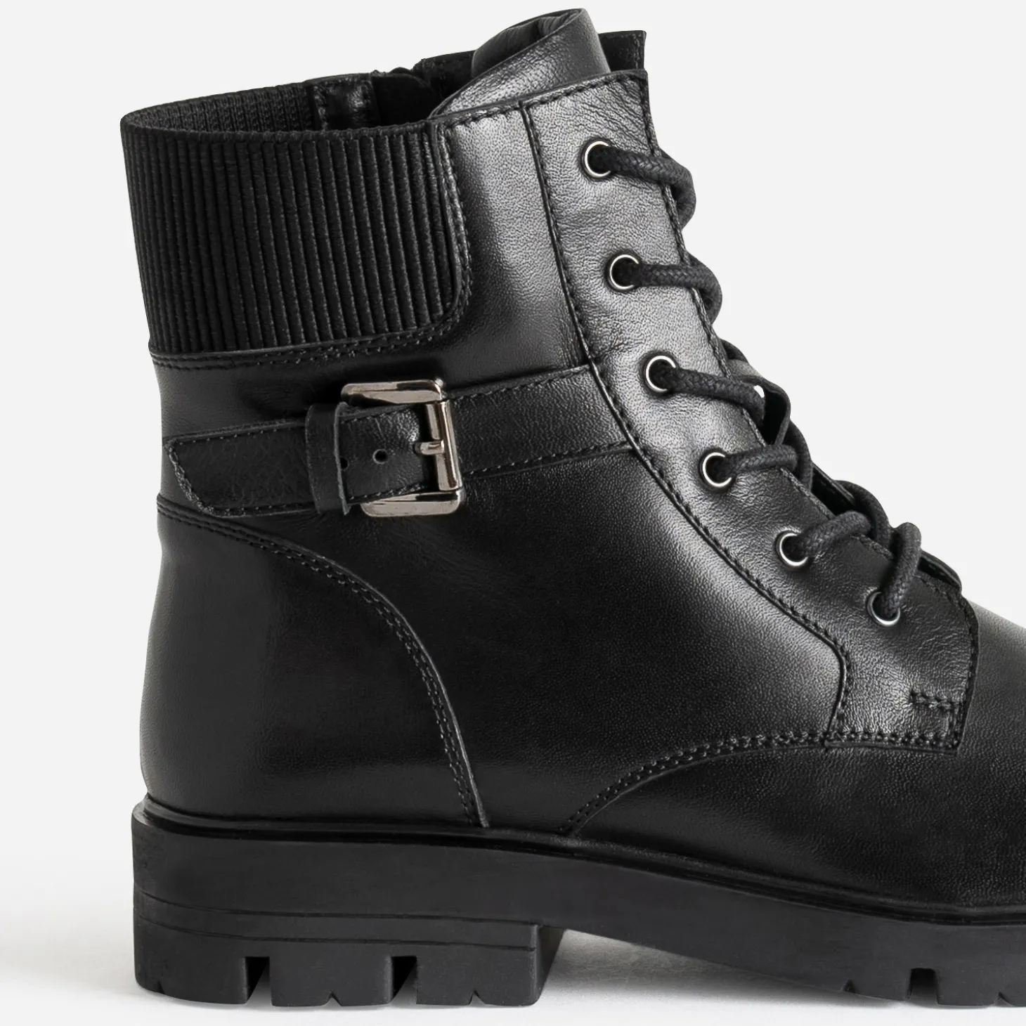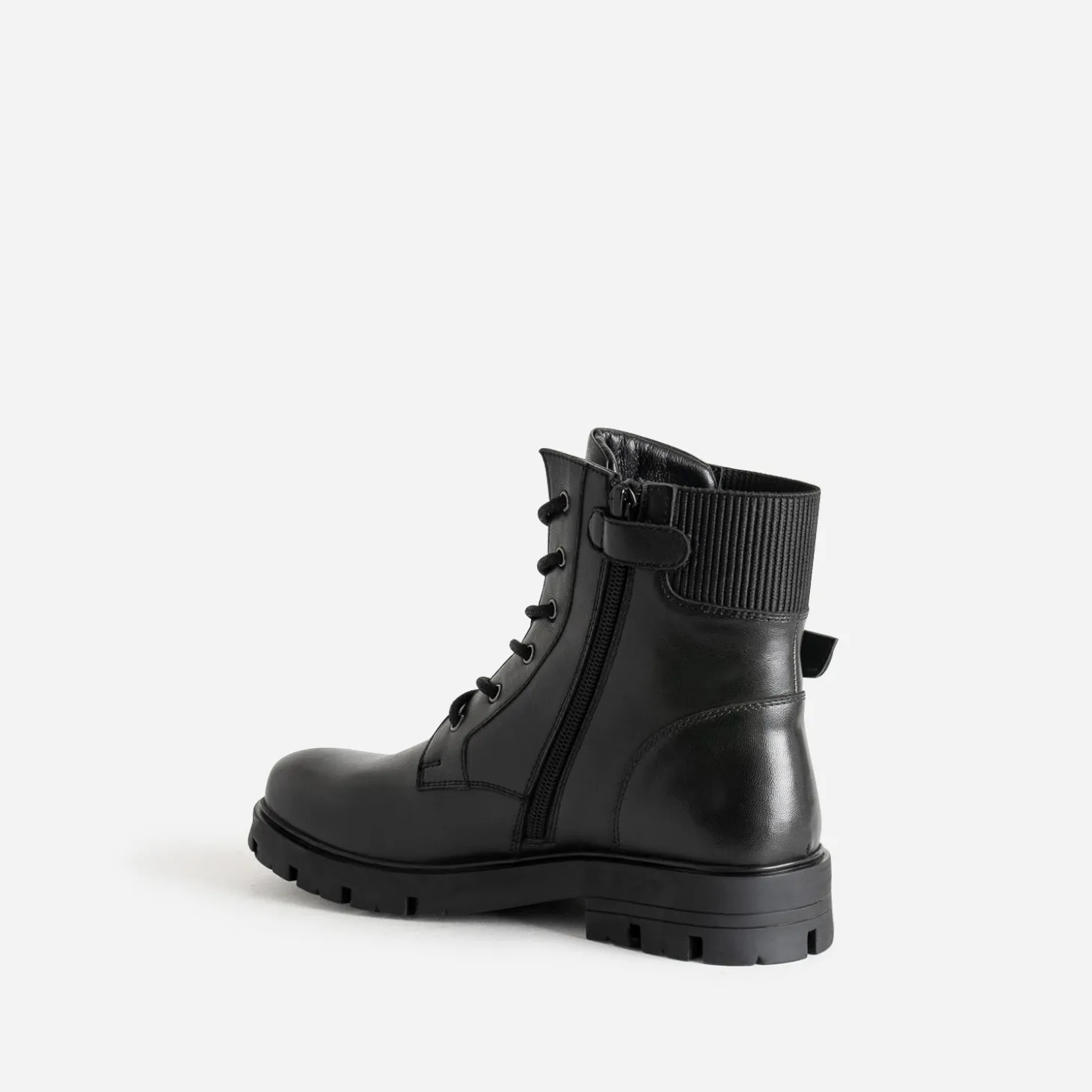 Celui qui traverse les hivers sans se démoder, c’est le boots à lacet. En cuir noir, il se démarque par une boucle décorative et un empiècement élastiqué sur le haut de la tige : tige fermée par un lacet et un zip intérieur. La semelle crantée promet une meilleure adhérence au sol. Un modèle iconique, inspiré du style militaire, à l’aise avec une robe longue ou un look plus rock.