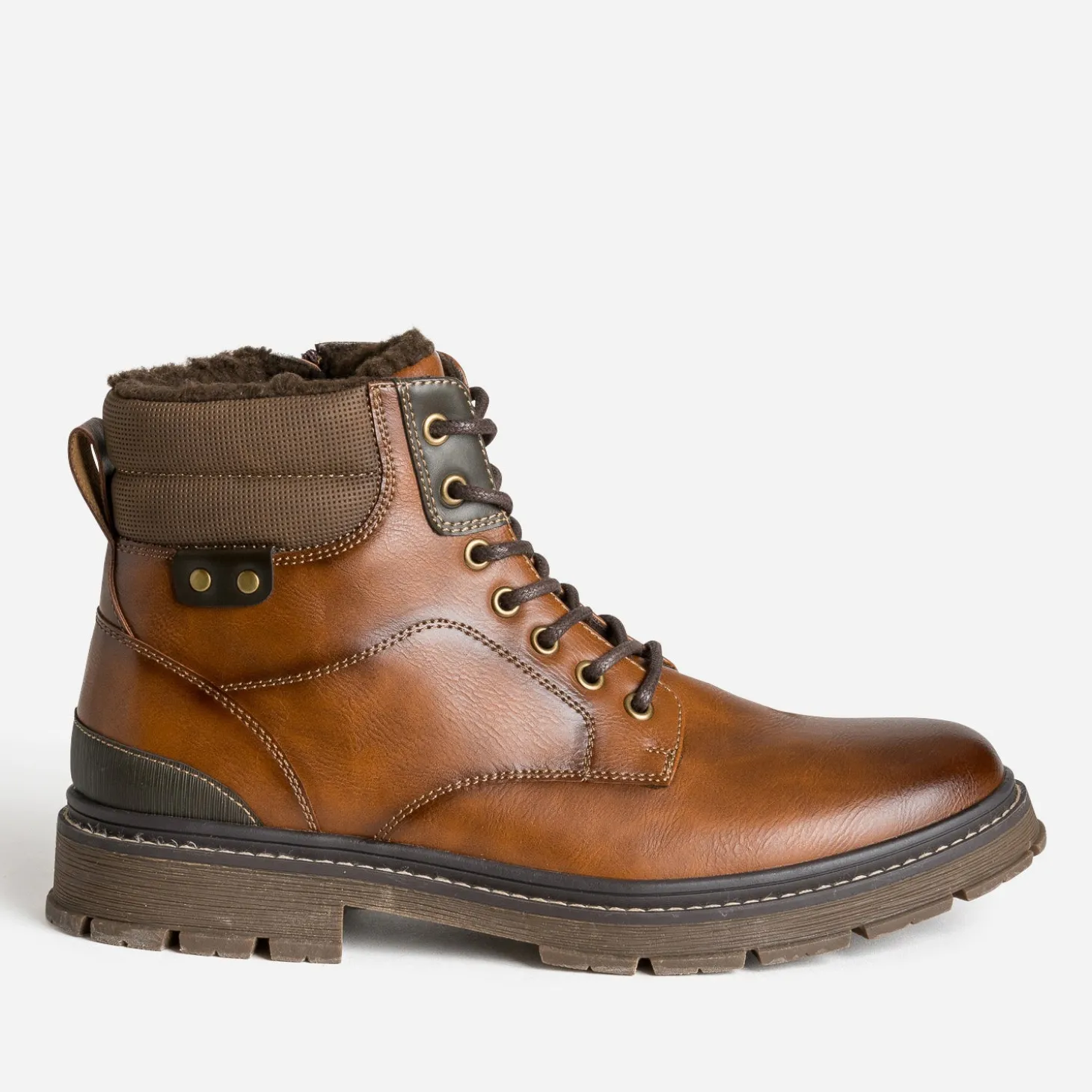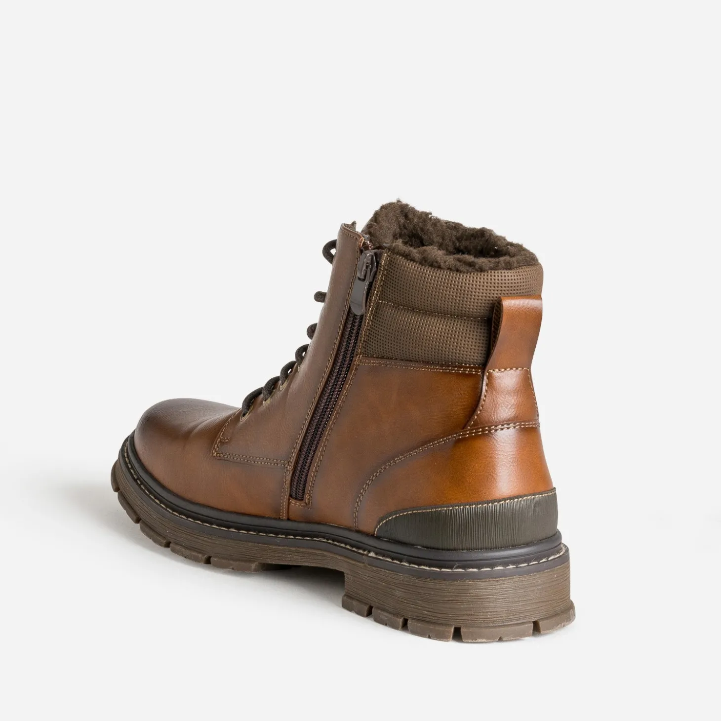 Ce boots pour homme est étudié et fabriqué spécialement pour affronter l’hiver avec sérénité. Comment ? Grâce à une doublure entièrement fourrée, qui maintient le pied au chaud. Grâce à une semelle crantée, qui garantit une adhérence optimale. En matière synthétique lisse, il se décline en coloris marron, avec effet patiné sur le bout et le bord des surpiqûres. Des empiècements plus foncés s’invitent sur les premiers œillets, le côté et le contrefort. La fermeture par lacet est renforcée par un zip intérieur. Un modèle à associer à un blouson aviateur en cuir velours marron et un pantalon cargo beige oversize.