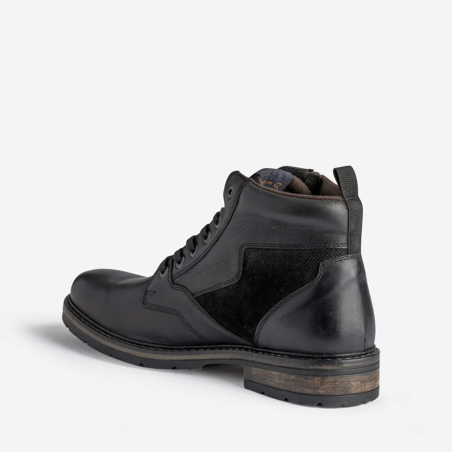 Envie d’un look worker jusqu’aux bouts des pieds ? Essayez ce boots à lacet pour homme. En cuir noir, il se laisse bousculer par des touches de cuir velours embossé sur les côtés et de cuir velours sur la languette. Fermé par un lacet, il présente aussi un zip extérieur, pour faciliter l’entrée du pied. Pièces en denim, surchemise à carreaux, parka militaire, sont ses meilleurs alliés de la saison.