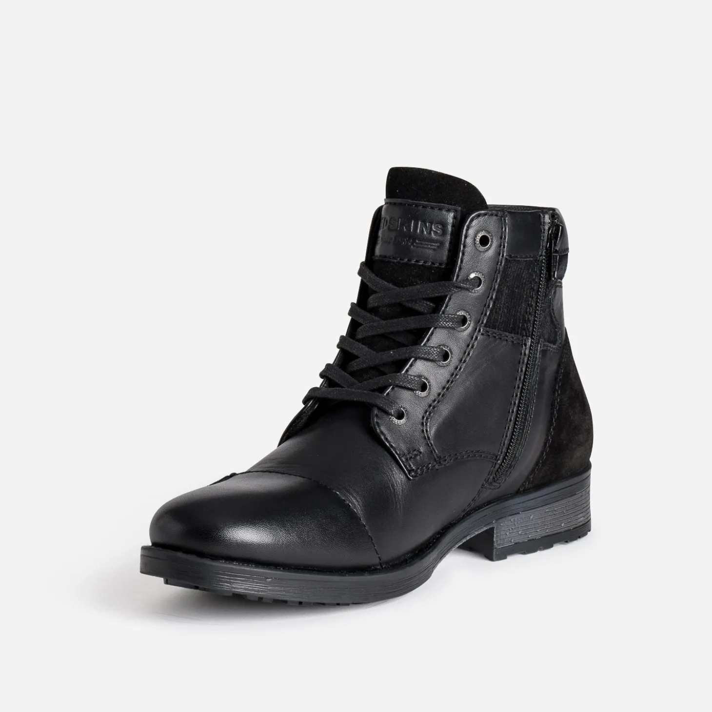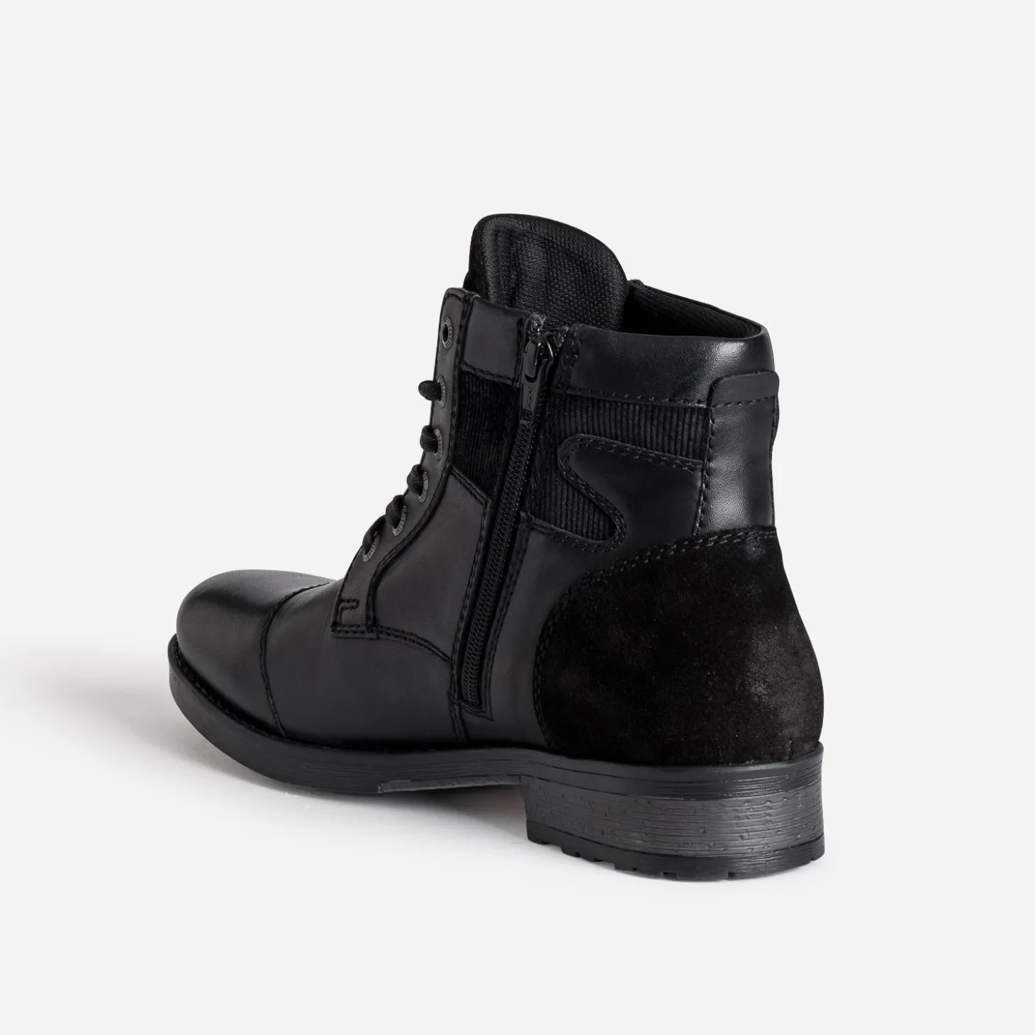 Esprit worker testé et approuvé avec ce boots pour homme. En cuir lisse noir, il se démarque par des empiècements en cuir velours sur le côté et le contrefort, et un empiècement en textile velours milleraies sur le haut de la tige. Un modèle à assumer avec un total look denim noir, plus ou moins délavé.