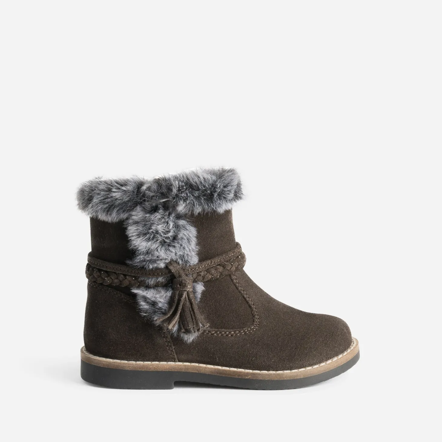 Ce boots fille est une valeur sûre du shoesing d’hiver. En cuir velours, il se décline en coloris marron foncé, décoré d’une double bride, l’une avec pampille et l’autre tressée. Le haut de la tige est bordé de matière fourrée, et il se ferme par un zip intérieur, pour faciliter l’entrée du pied. Un modèle idéal, autant avec les robes qu’avec les pantalons et les jeans.