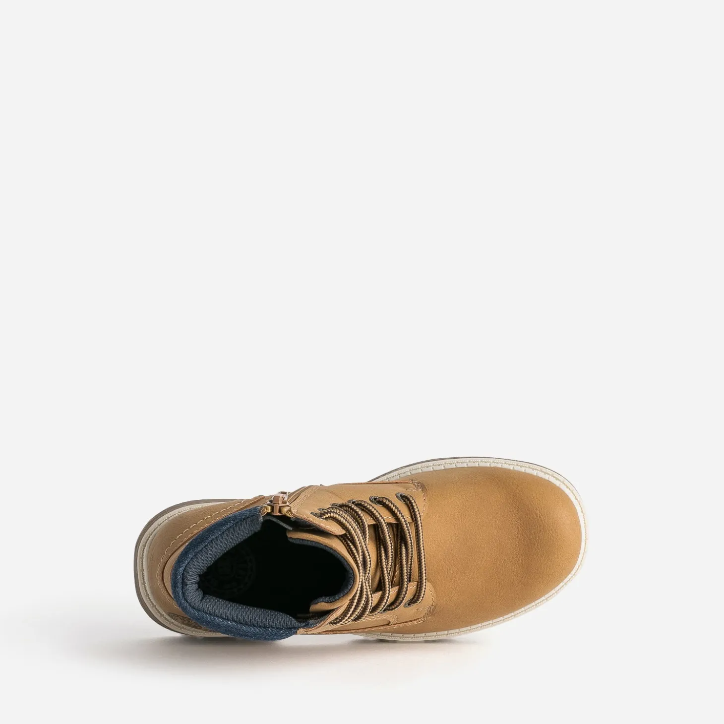 Inspiration workwear pour ce boots dédié aux garçons. En matière synthétique, il se décline en coloris jaune ocre et rehaussé d’un empiècement en textile bleu effet denim. Il se ferme par lacet-cordon, doublé d’un zip intérieur et sa semelle crantée garantit une adhérence sur tous les sols. Un modèle à associer avec un total look jean, chemise, pantalon, veste boutonnée.