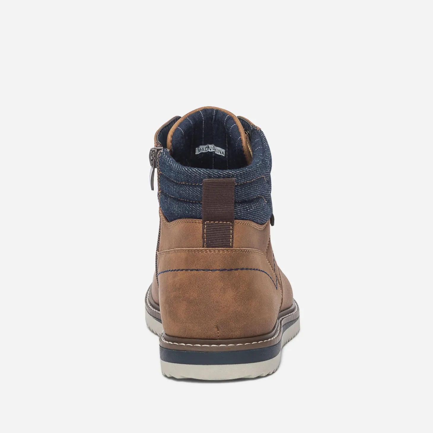 Semelle crantée et tige montante, col matelassé et lacet esprit cordon, le boots homme se prépare à affronter l’hiver, en s’inspirant des montagnards. En matière synthétique camel, il présente un empiècement en textile marine esprit denim et une doublure imprimée à rayures tennis. La fermeture par lacet est renforcé par un zip intérieur. Un modèle à imaginer par grand froid, avec pull à col roulé, jean et parka. Vivement l’hiver !