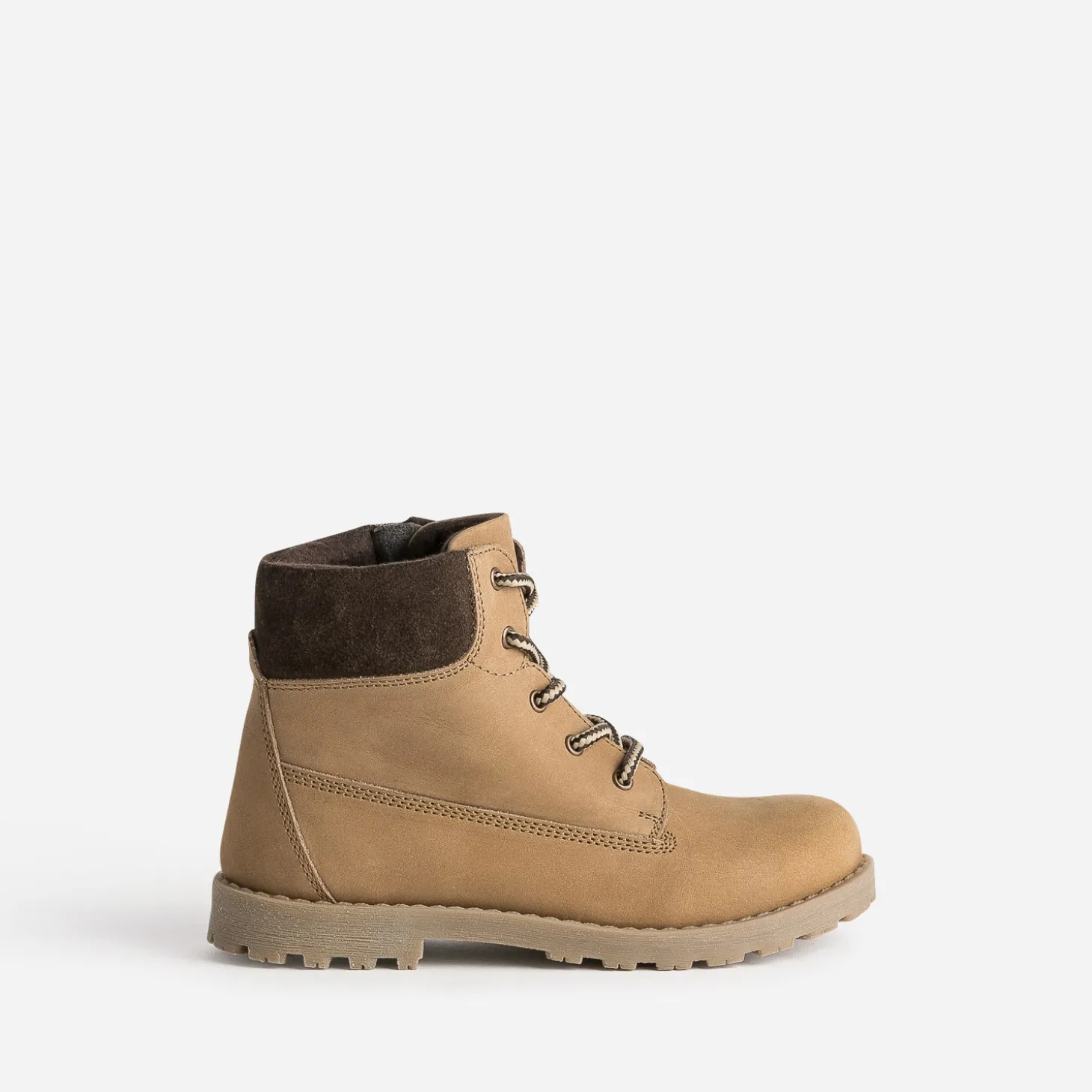 Le boots est un essentiel du dressing d’hiver. En cuir nubuck camel, il est rehaussé et doublé de textile marron et se ferme par un lacet esprit cordon. Imaginez-le avec un total look denim, réchauffé d’une parka kaki.