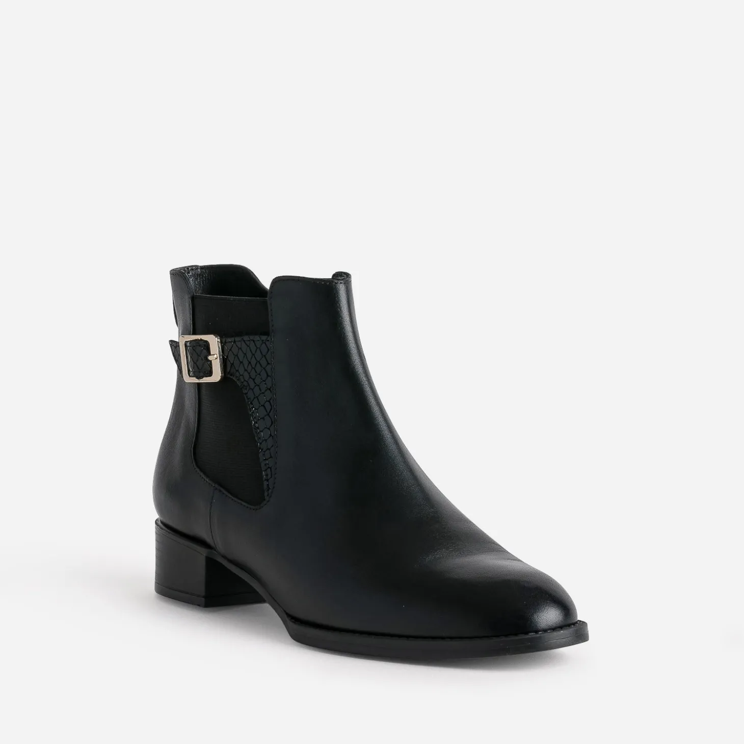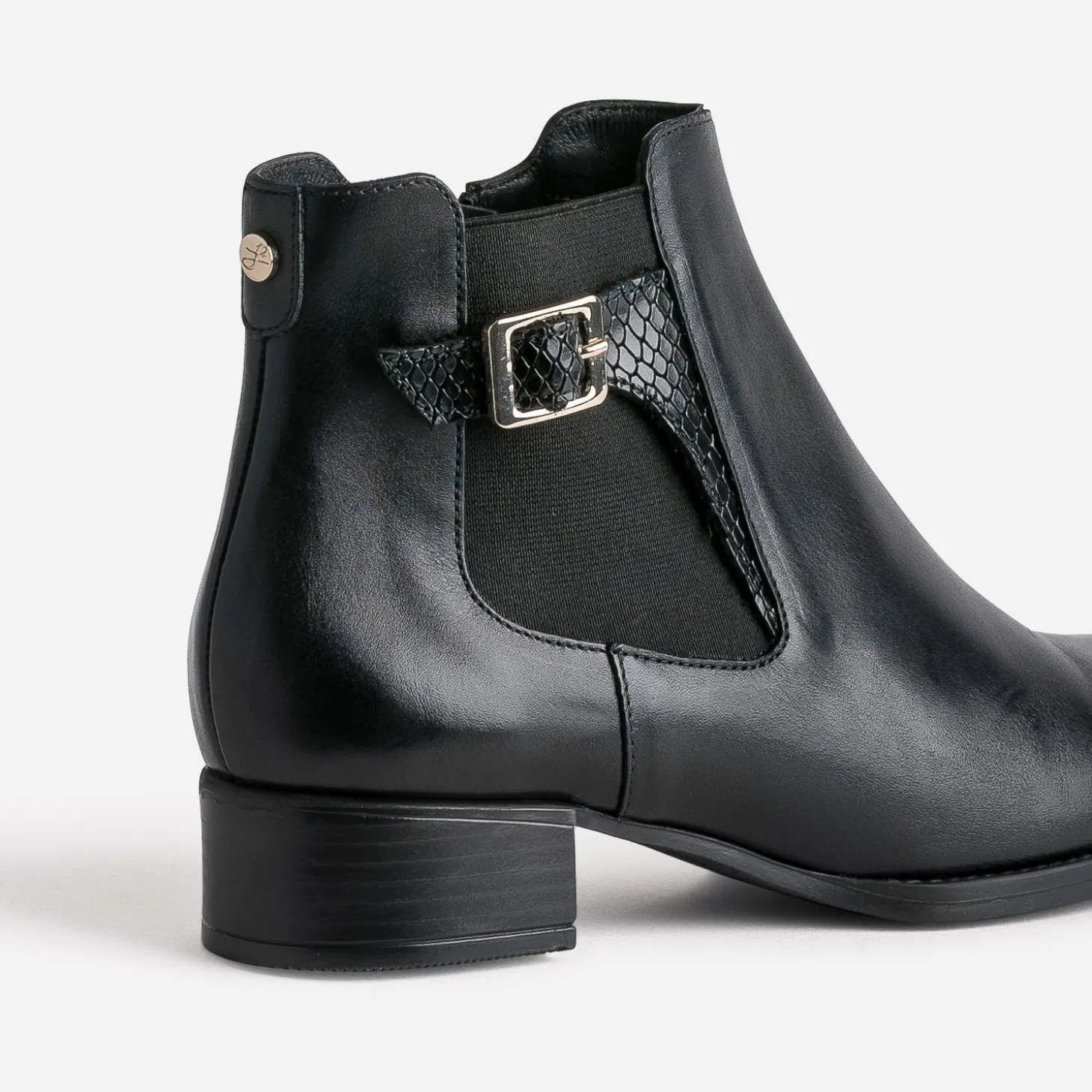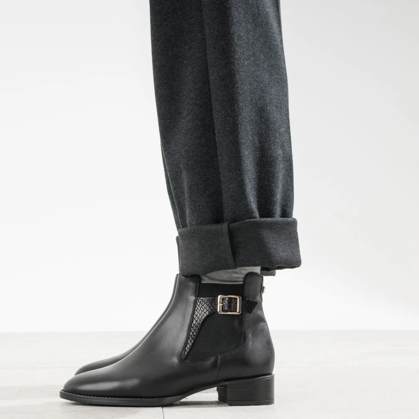 Modèle essentiel du shoesing, le boots plat séduit par son élégance innée. En cuir lisse noir, il multiplie les détails pour gagner en valeur ajoutée : élastique latéral, patte en cuir embossé effet python, zip intérieur, talon décroché, semelle première amovible. Ses propriétés d’amorti, de respirabilité et de durabilité ne sont plus à prouver. Un modèle intemporel, pensé pour durer dans le temps.