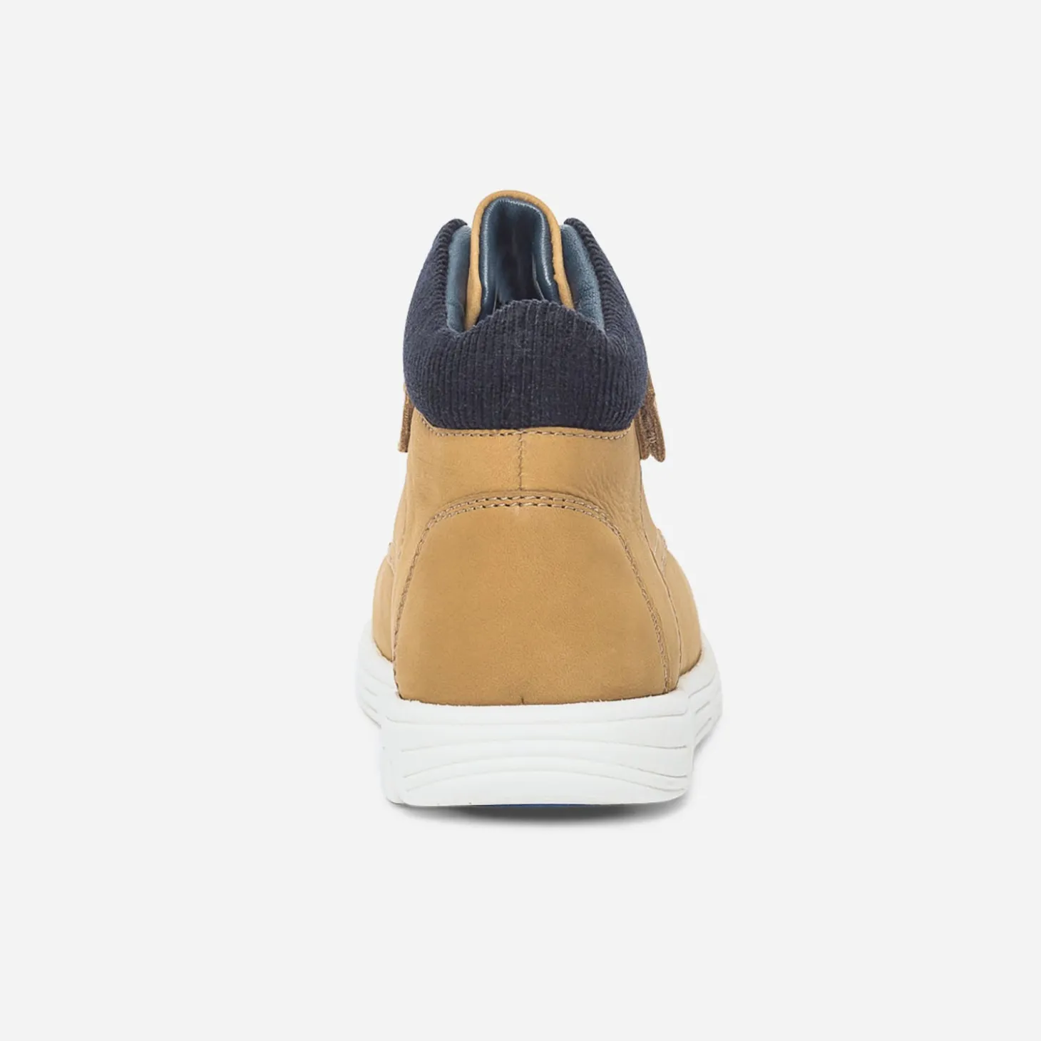 Pour marcher, pour courir, pour sauter, pour vivre ! Le boots garçon a plutôt intérêt à assurer sur tous les fonts ! En cuir nubuck jaune miel, il présente un haut de tige matelassé en velours côtelé bleu marine, un lacet élastiqué et un scratch pour maintenir parfaitement le pied. Il est monté sur une semelle sport crantée pensée pour les amortis. Un modèle très outdoor, pour vous suivre dans toutes les aventures !