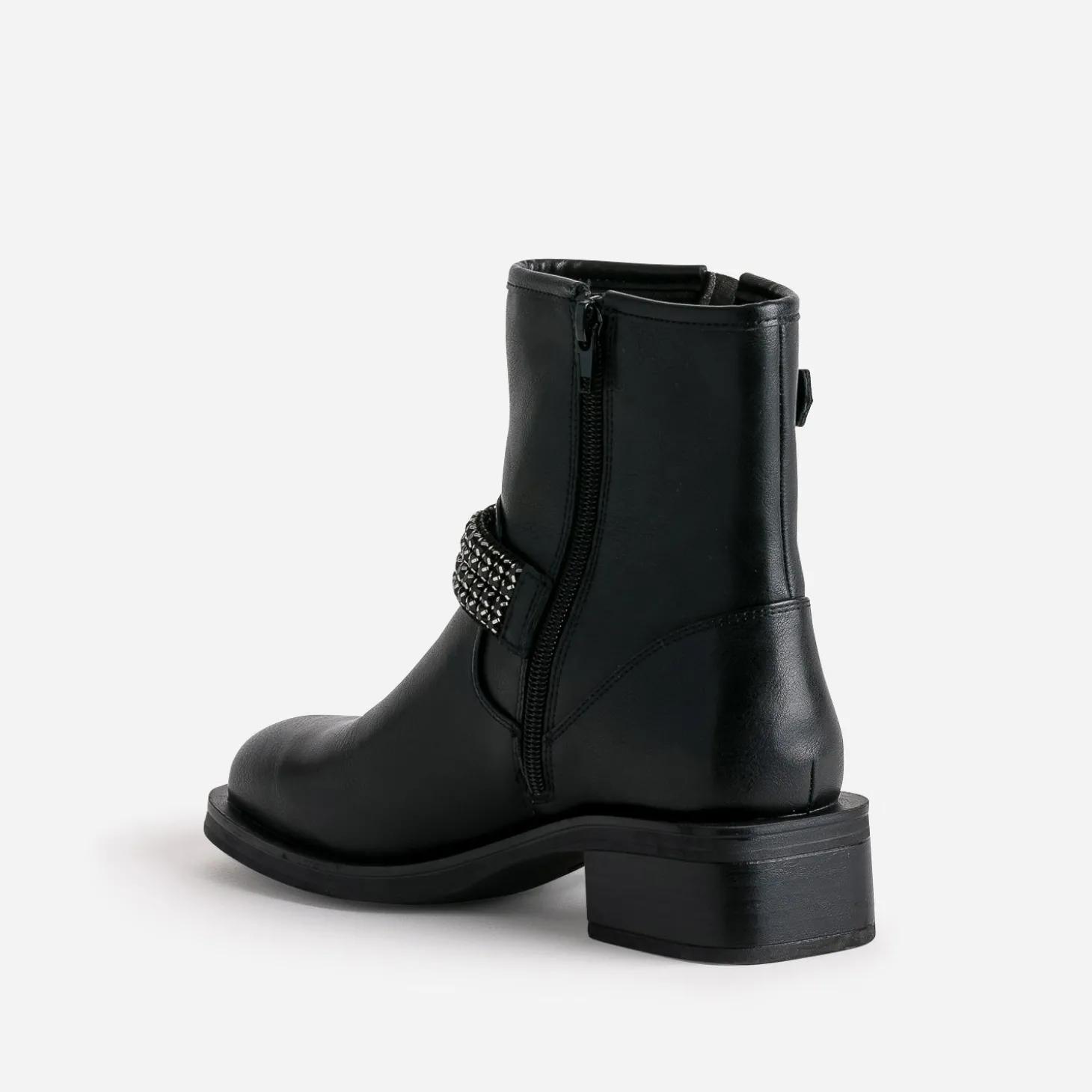 Ne résistez pas à l’appel du style motard. Laissez-vous transporter par son caractère racé, marqué par un bout et un talon carrés. En matière synthétique noire, il ose, le pas de côté, en revisitant la bride avec féminité : un décor de strass facettés ton sur ton. Un modèle à associer avec un tee-shirt gris lamé sous un blazer noir, et un jean slim noir, sans oublier maxi manchette et sac souple sur l’avant bras.