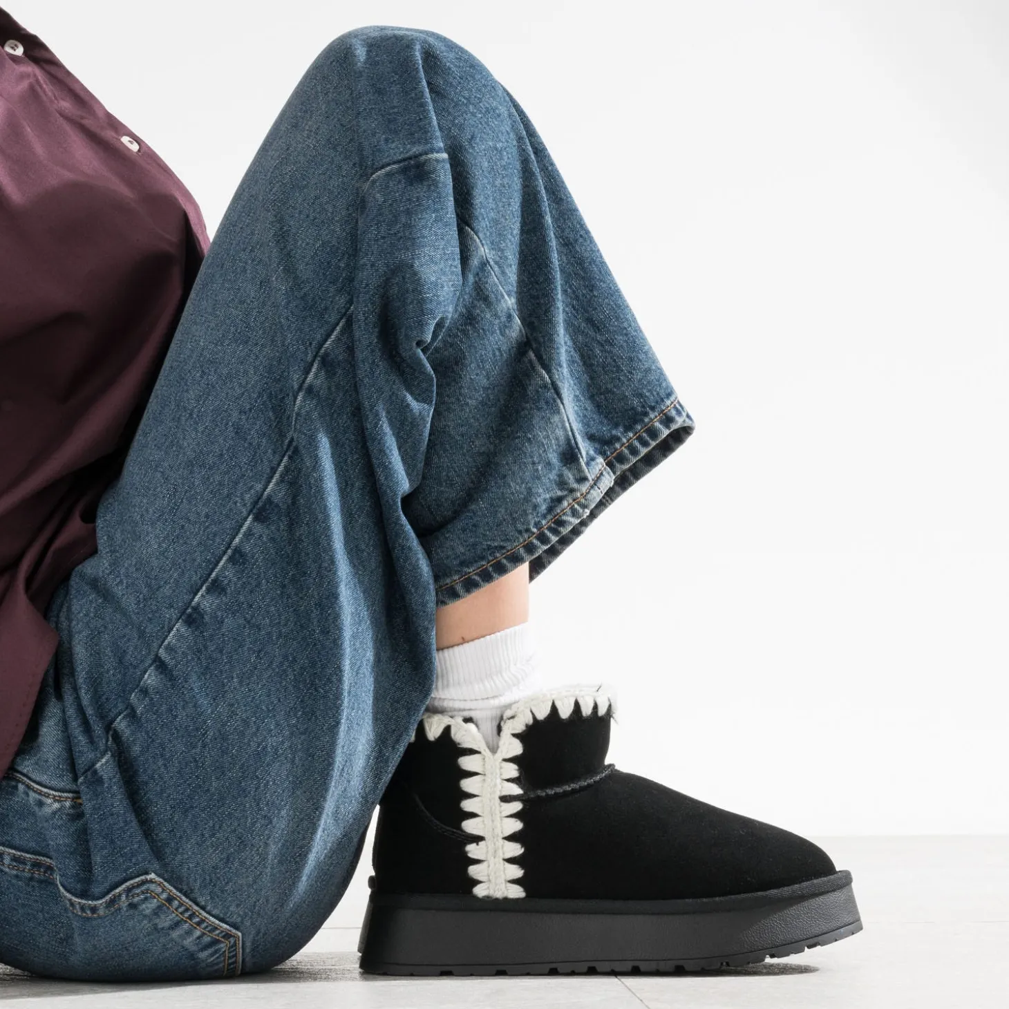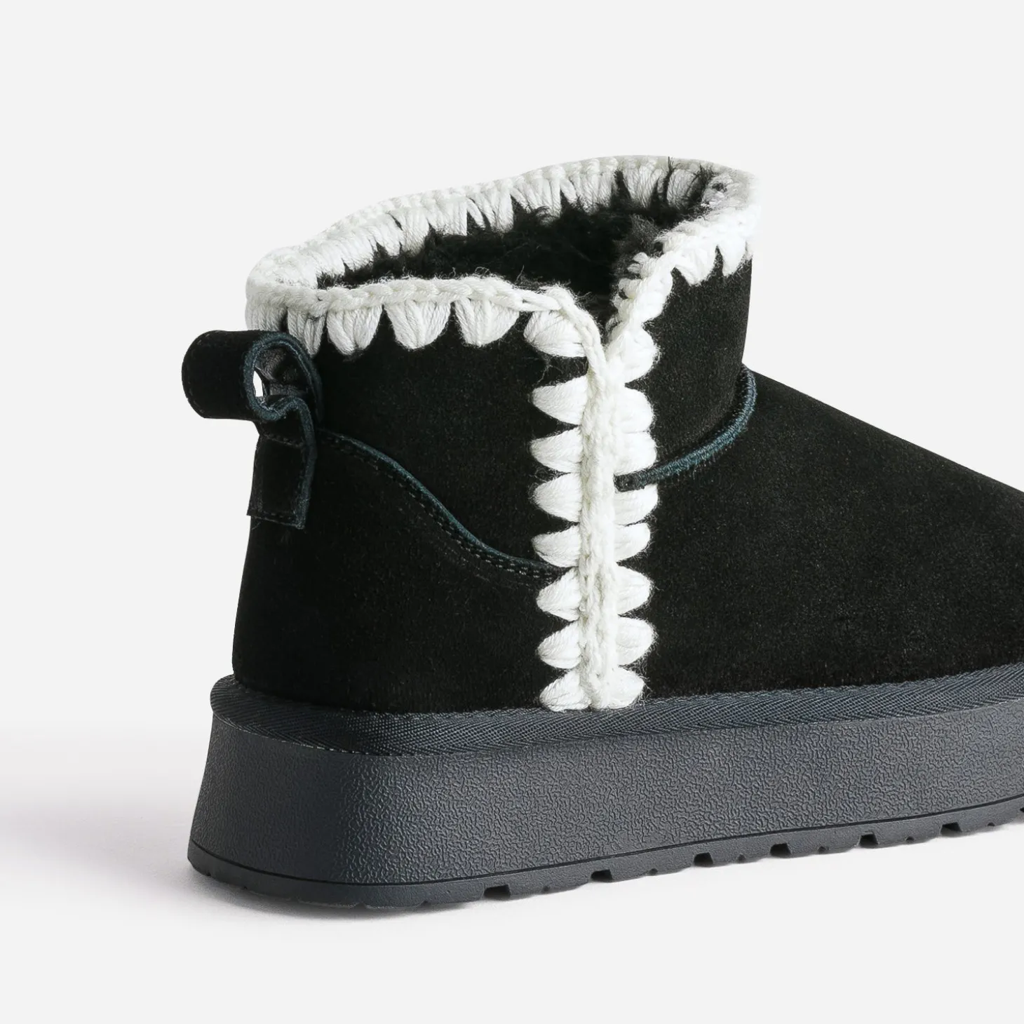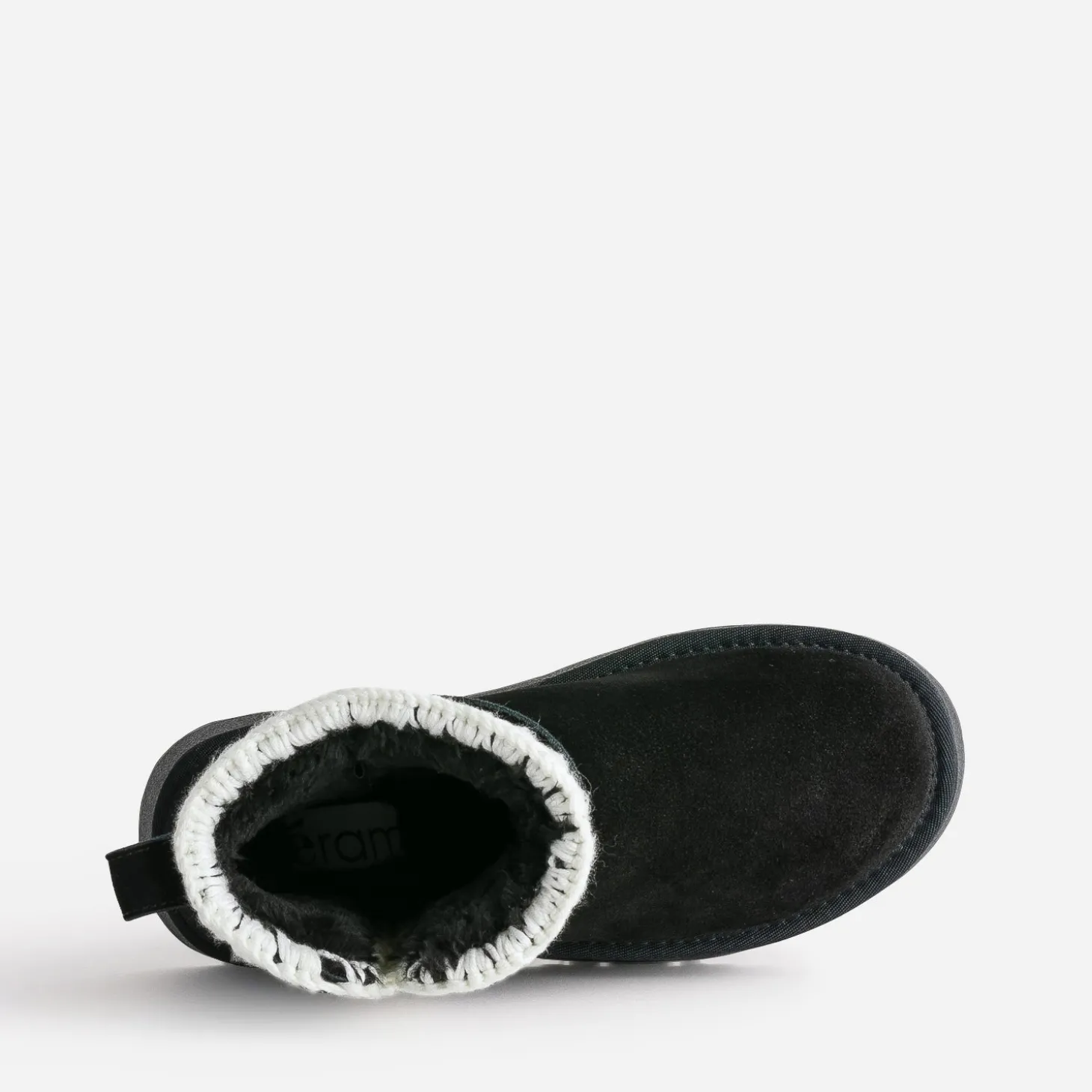 Le boots fourré a ses adeptes. Entièrement fourré, il est confectionné en cuir velours et se décline en couleur noir. Il associe une tige semi-montante, finalisée d’une broderie écrue, à une semelle à plateforme ton sur ton. Un modèle de style ethnique à combiner avec un look monochrome, avec robe en maille, ou crop top à col roulé et manches longues sur un jean large à taille haute.