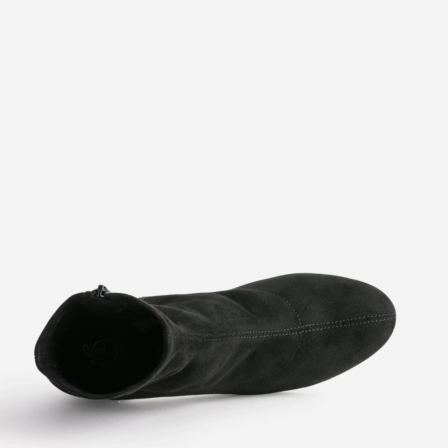 Douceur de la suédine, finesse de la ligne, sobriété du noir, ce boots est un essentiel du shoesing féminin. Il monte bien au-dessus de la cheville et épouse le pied, comme une seconde peau. Impossible de ne pas savoir avec quoi le porter : en jean skinny, ou bien en jupe ou robe avec de jolis collants, privilégiez des vêtements qui affinent la silhouette et notamment les jambes.
