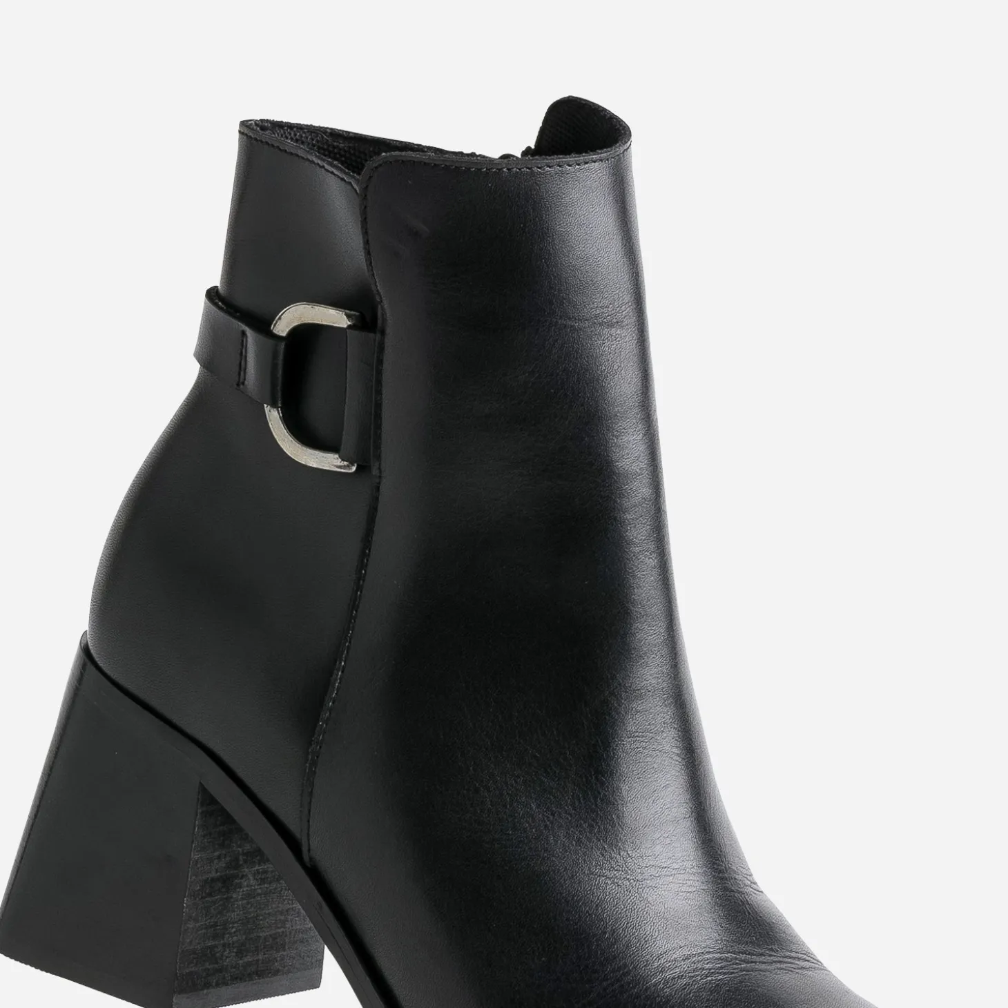 Le boots femme a ce je-ne-sais-quoi d’intemporel et d’élégant, en toutes circonstances. En cuir noir, il est monté sur un talon légèrement flare de 7 cm, présente un bout carré et une tige asymétrique, soulignée d’une bride arrière avec un anneau en D. En costume-pantalon ou en robe fluide, il affectionne le style masculin-féminin, sans pareil.
