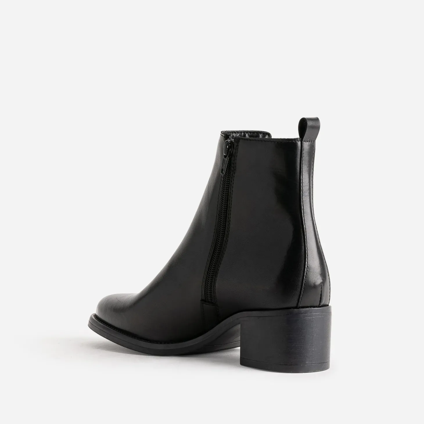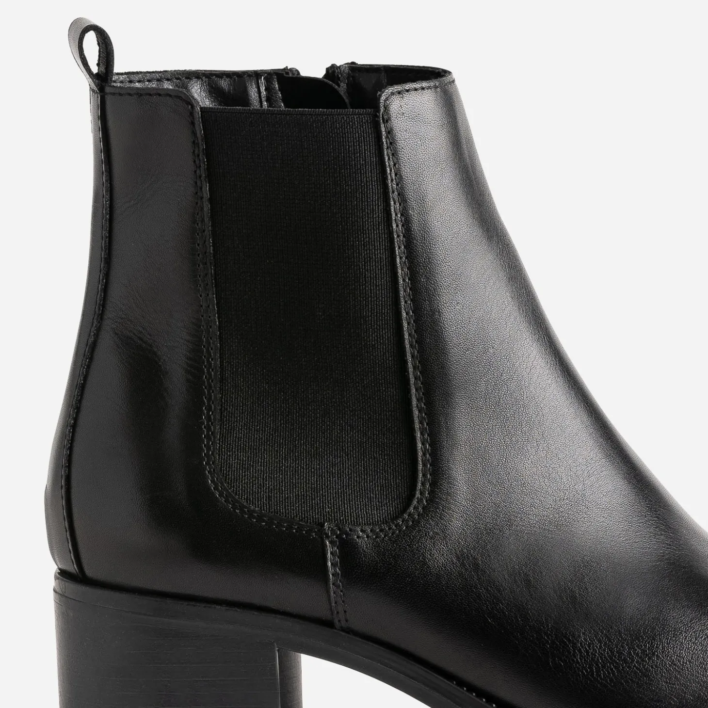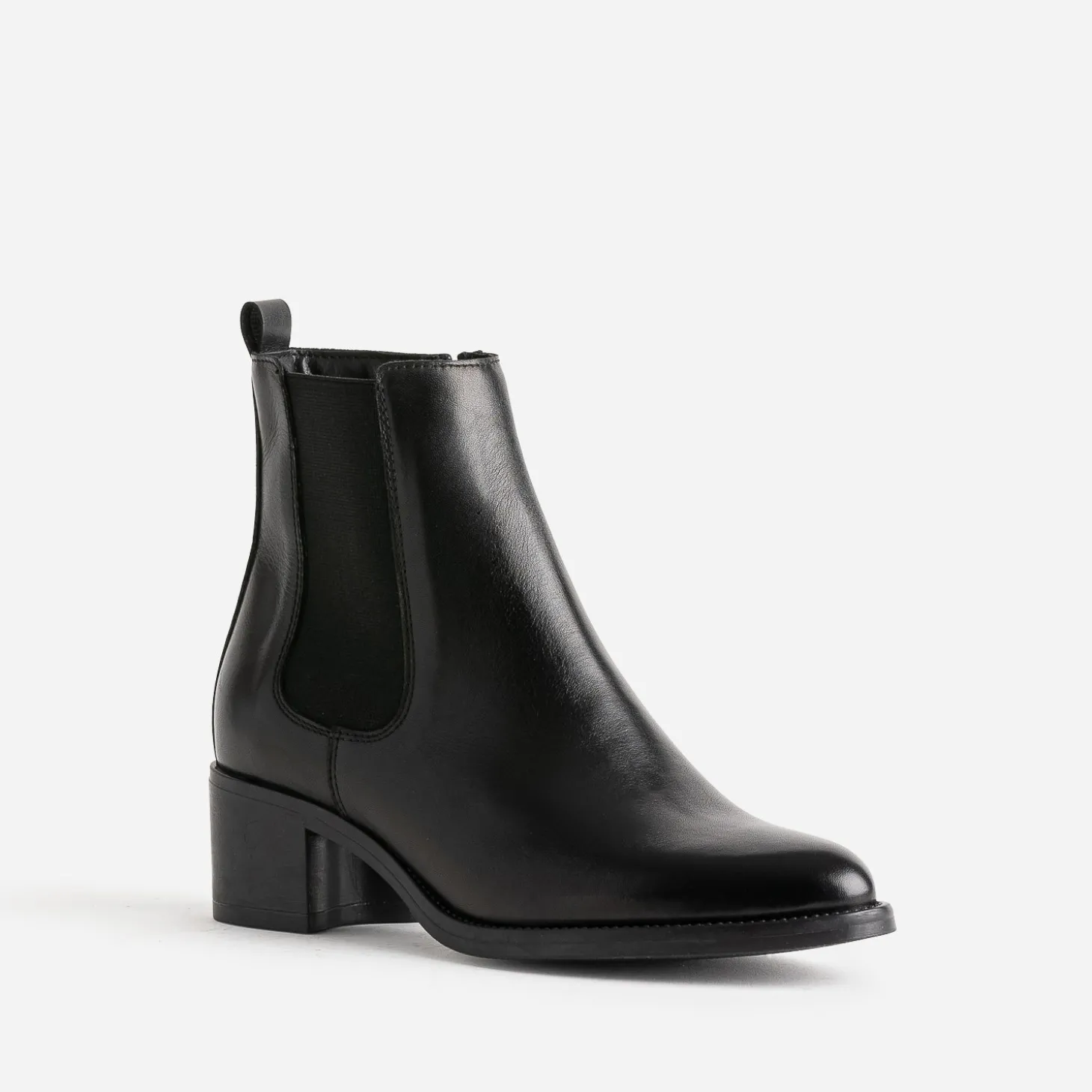 Ce boots noir a quelque chose d’irrésistible. Est-ce son cuir lisse noir ? Son bout pointu ? Son talon large de 5 cm ? Ou son élastique latéral ? Le mieux est de l’essayer pour vous faire votre propre idée. Avec une chemise blanche et un pantalon de costume noir, avec un pull à col V gris et un slim noir.