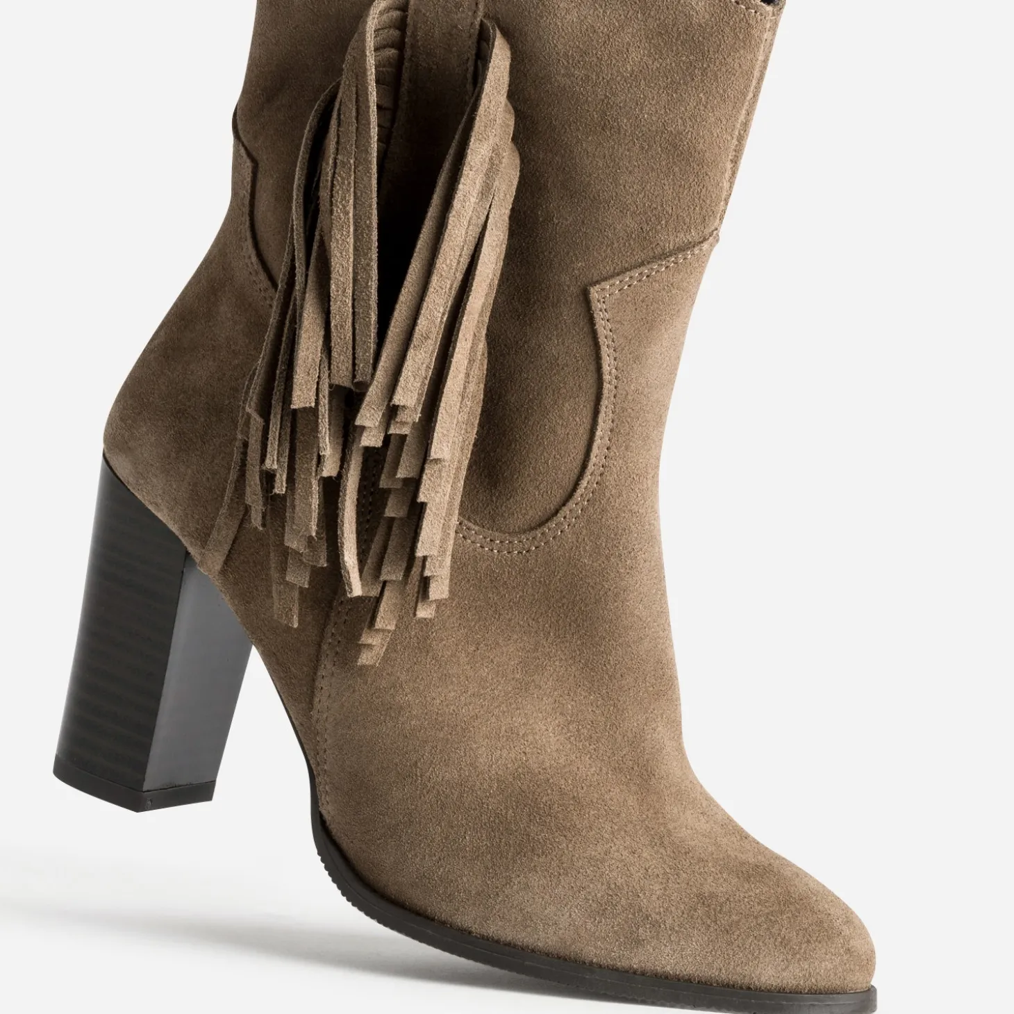 Oubliez le billet pour le Texas. Avec ce boots pour femme, c’est le Texas qui vient à vous ! En cuir velours taupe, il est monté sur un talon haut de 8 cm et se pare de franges sur le côté. Un modèle qui mérite d’être montré ! Misez sur un jean slim glissé à l’intérieur, un jean cropped ou une robe midi, qui laisseront les franges affirmer leur statut mode.