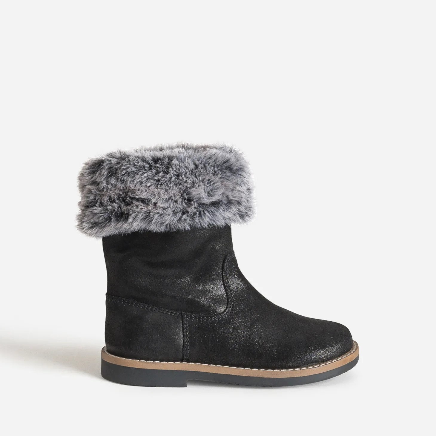Cette botte pour fille pourrait devenir le modèle incontournable de la saison. D’abord, pour son cuir velours, avec une finition irisée. Ensuite, pour sa tige doublée de fourrure synthétique ; tige à double porté, haute ou avec revers, pour multiplier les styles. Un modèle très à l’aise avec les robes et jupes de la saison.