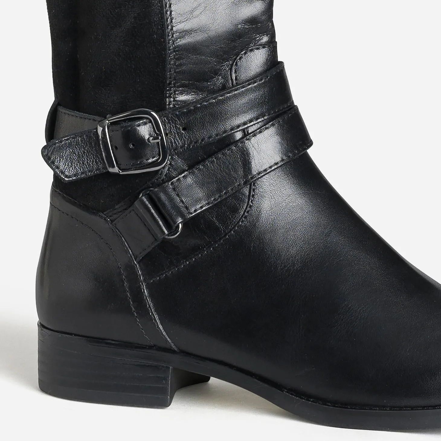 La botte bi-matière pour femme revient sur le devant de la scène mode. La tige haute associe cuir lisse et textile suédée extensible dans un même coloris noir, gagnant une aisance évidente. Inspiration jodhpur, elle présente une double bride à la cheville et se ferme par un zip intérieur. Montée sur une semelle dotée de la technologie ‘onAIR’, elle promet un meilleur amorti et une aération optimale. Un modèle féminin, à porter en journée et en soirée, avec vos robes et jupes du quotidien.