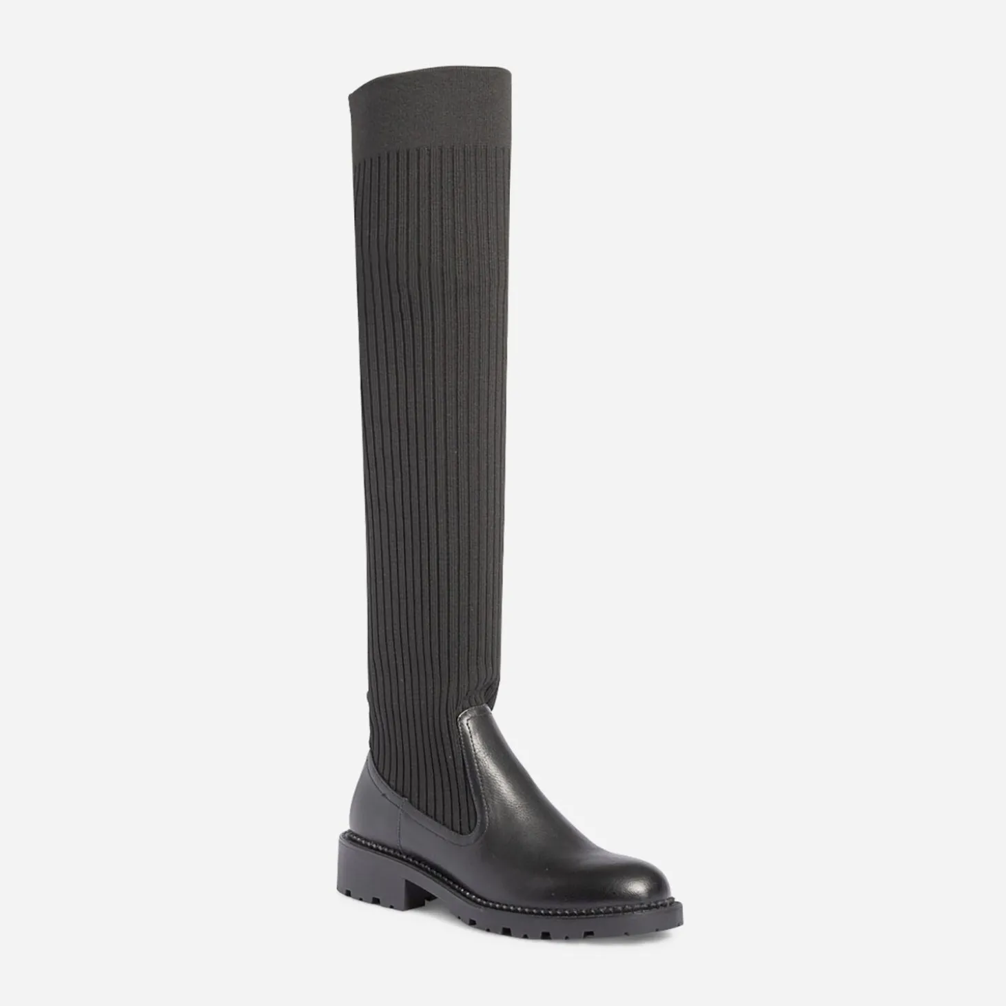 Duo de matières maîtrisé pour look ultra stylé. La botte pour femme n’a pas dit son dernier mot ! En cuir synthétique noir, elle se démarque par une tige élastiquée côtelée façon chaussette ton sur ton, qui vient complètement épouser la forme du mollet. Monté sur une semelle crantée, elle s’invite sur tous les catwalks urbains, en journée comme en soirée. Un modèle à privilégier avec un bas court, par exemple avec une jupe en tartan rouge, incontournable cette saison, et un pull à col roulé noir.