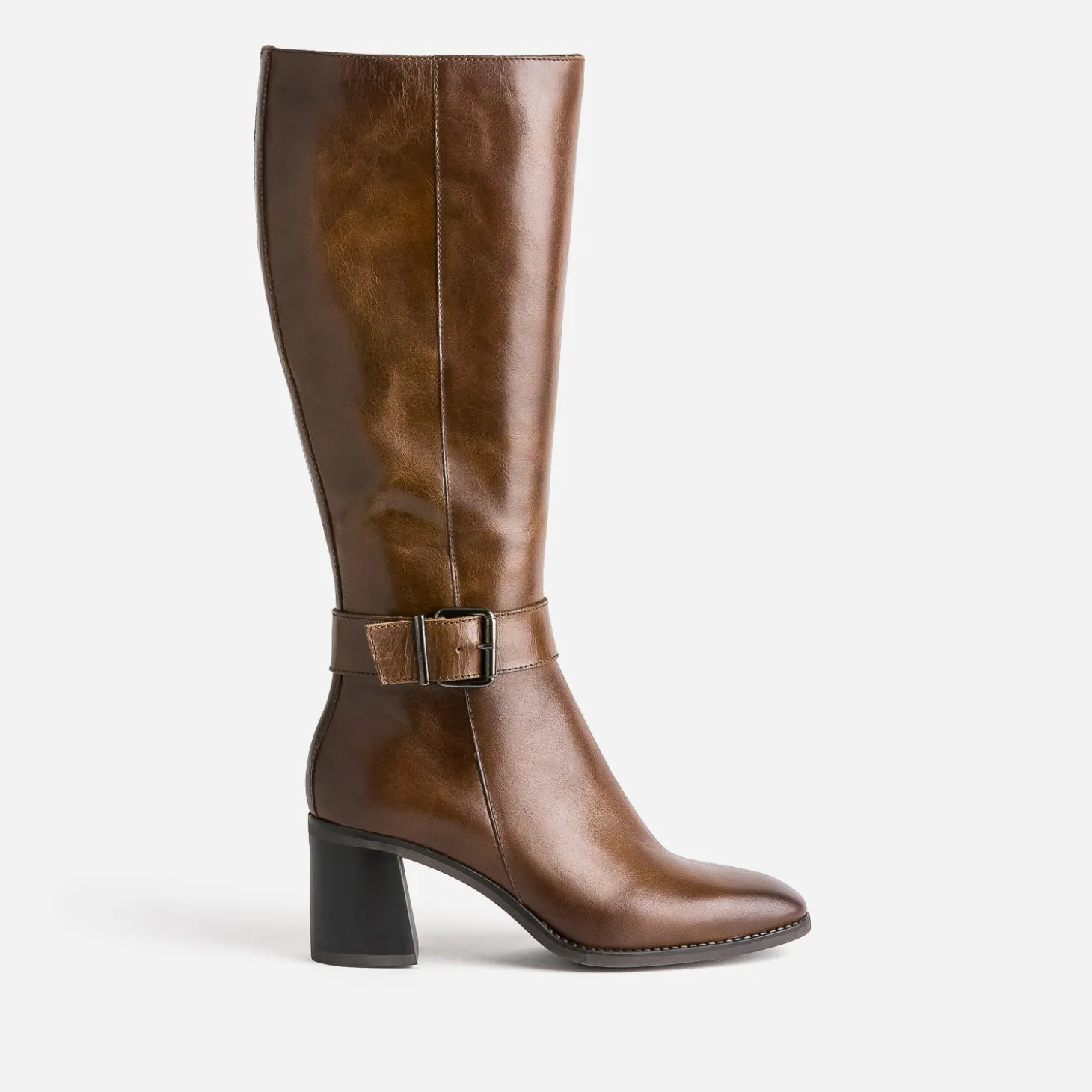 Admirez sa ligne sublime. Approuvez son cuir souple. Essayez son talon flare et son bout carré. Faites l’expérience d’une botte pour femme qui frise la perfection, rehaussant toutes les tenues d’une élégance rare. Marron, elle est soulignée d’une bride au niveau de la cheville et se ferme par un zip intérieur. Privilégiez-la avec une robe chasuble, une robe patineuse ou une robe longue, dans les tons vert foncé.
