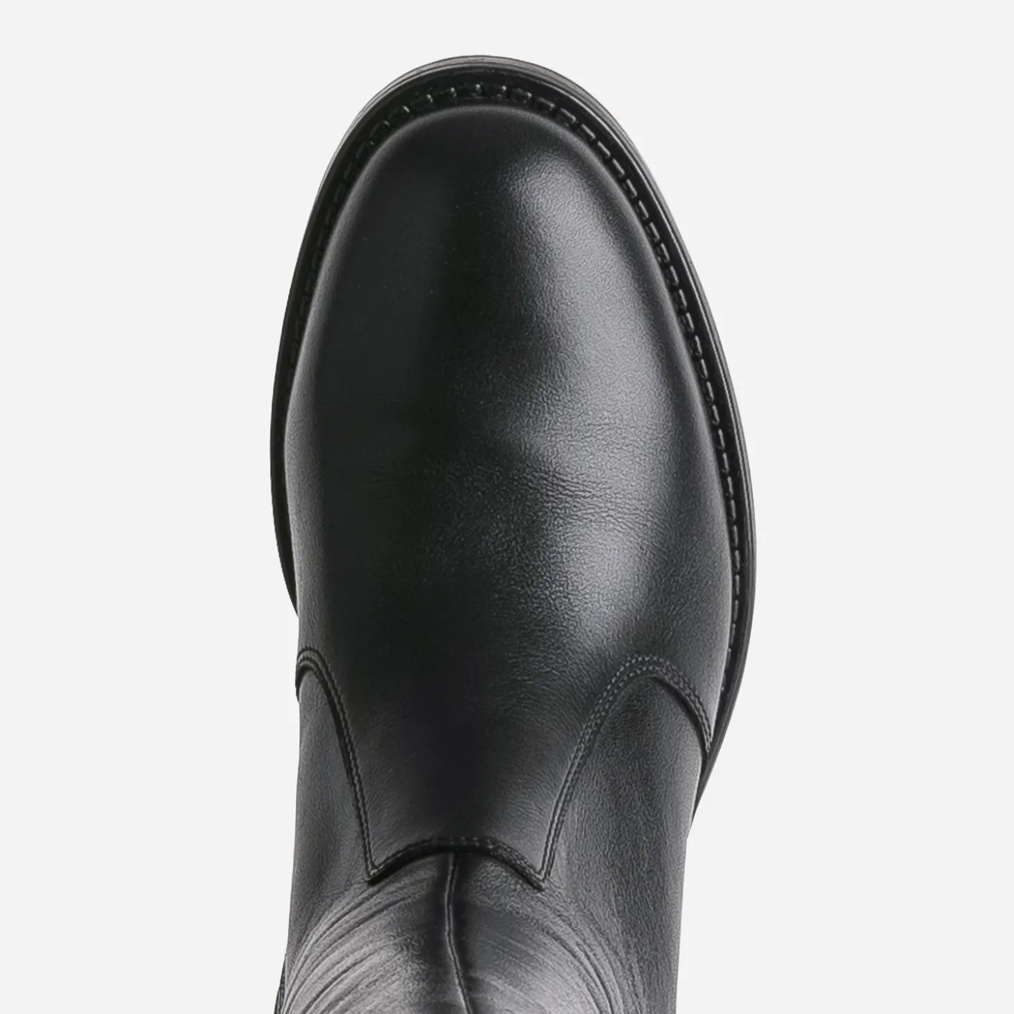 Soulignée par une bride placée à l’arrière de la cheville, la botte pour femme adopte l’esprit jodhpur. Elle doit son confort à sa tige, stretch à l’arrière du mollet et zippée sur l’intérieur. En matière synthétique noire, elle se porte de préférence avec une jupe ou une robe, courte, midi ou longue.