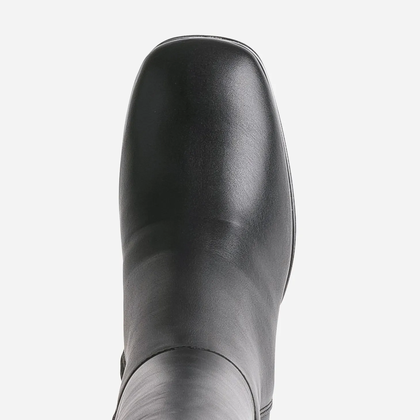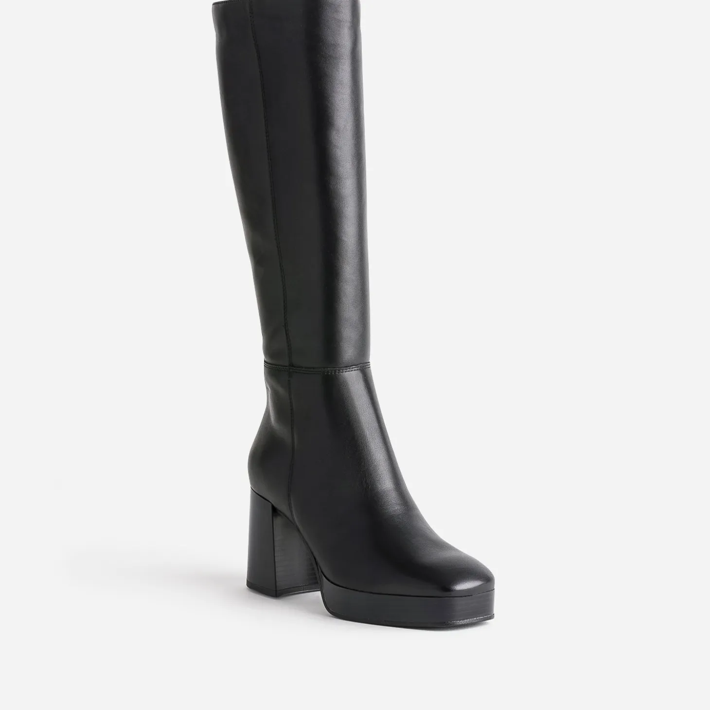 Une tige toujours plus haute. Un talon toujours plus flare. Une plateforme toujours plus disco. Laissez-vous tenter par cette botte femme. En cuir noir, elle est montée sur un talon de 8 cm et un patin avant de 2 cm. L’occasion de sortir en robe chasuble ou en mini-short à paillettes !
