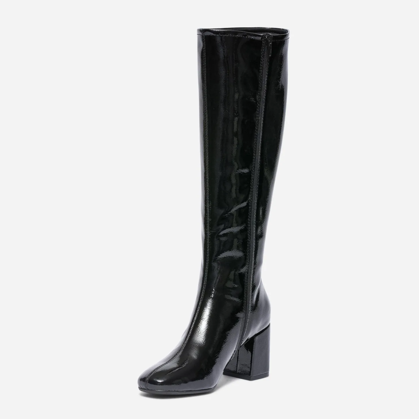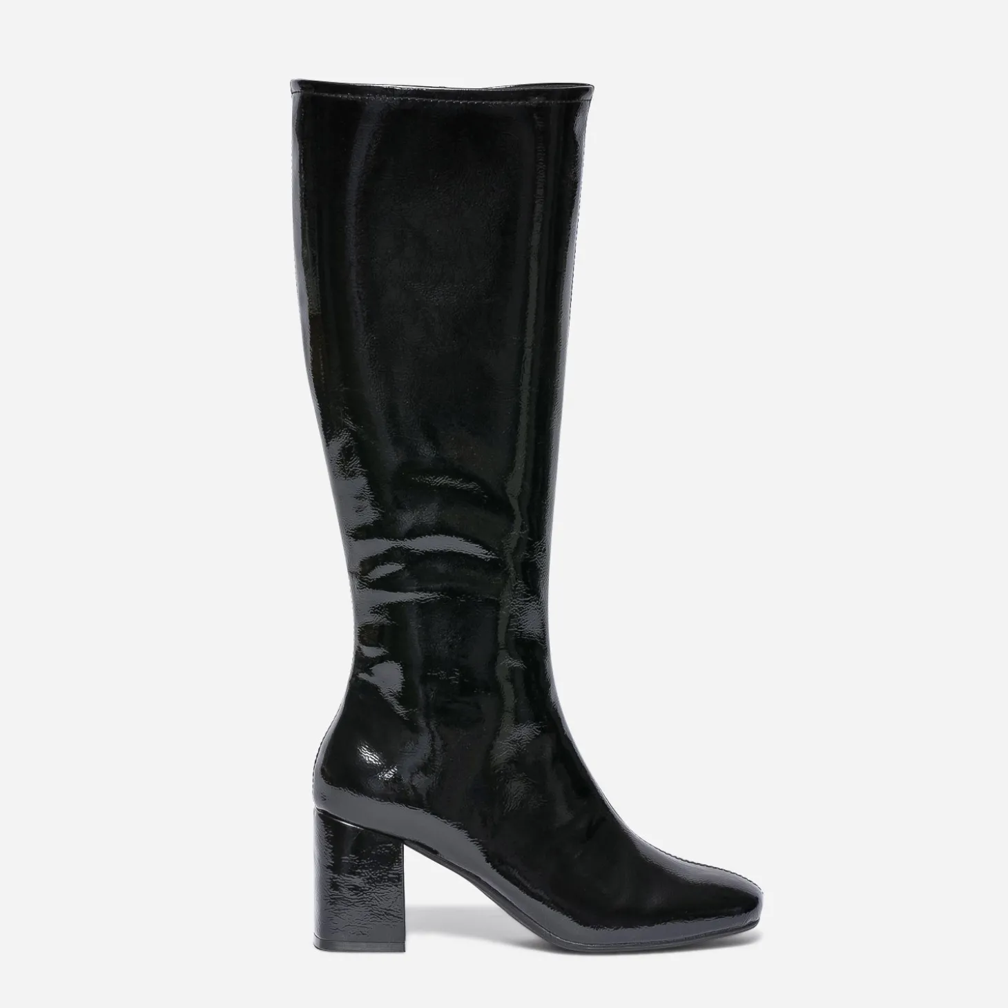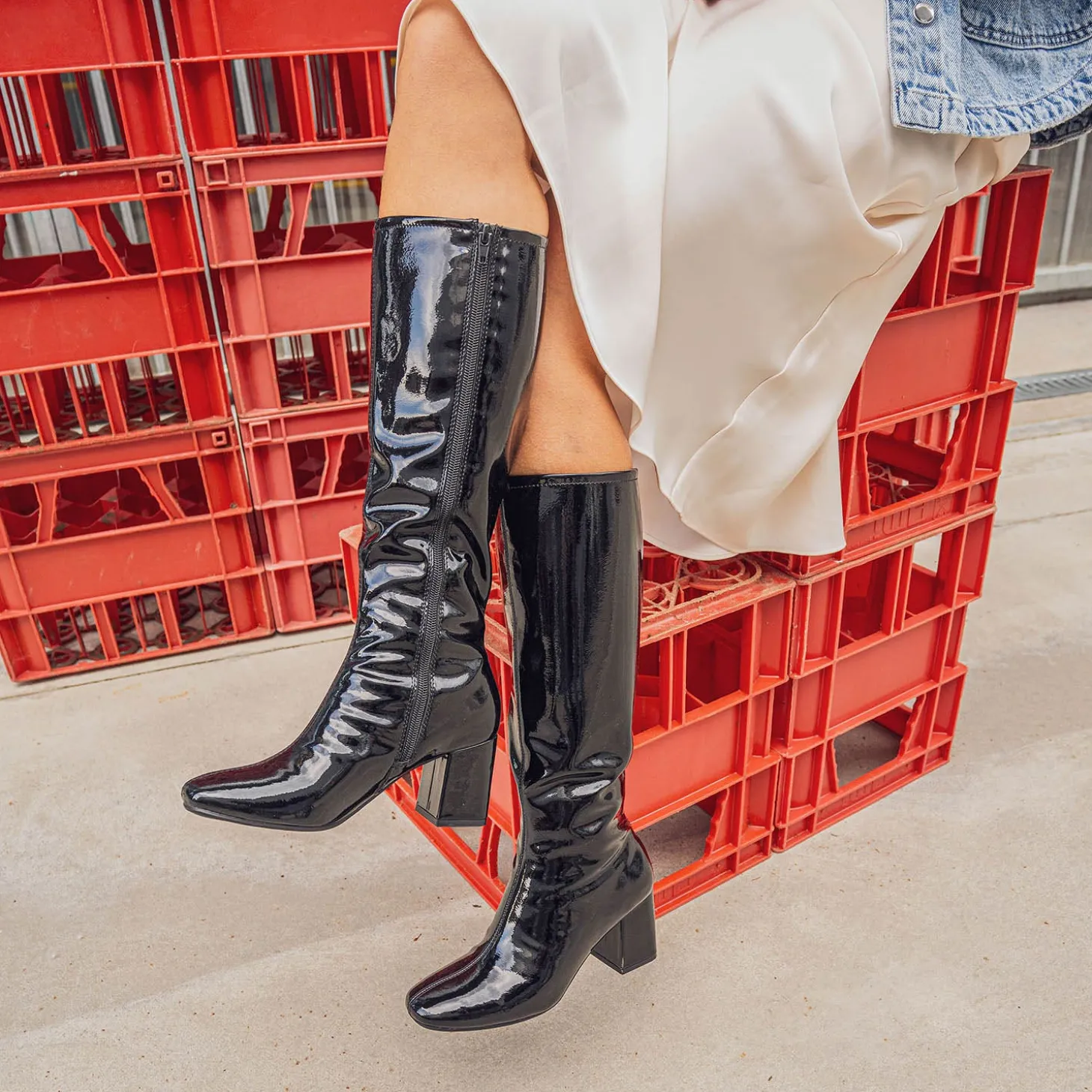 La tentation est grande ! Matière synthétique souple, coloris noir intemporel et finition vernie, cette botte sort le grand jeu pour vous séduire. Elle est montée sur un talon carré de 7 cm, idéal au quotidien. Faites l’essai avec un pull chaussette et une jupe trapèze, ou bien avec un combi short et des collants plumetis, et vous ne pourrez plus les quitter. Tour de mollet (pointure 37) : 36 cm