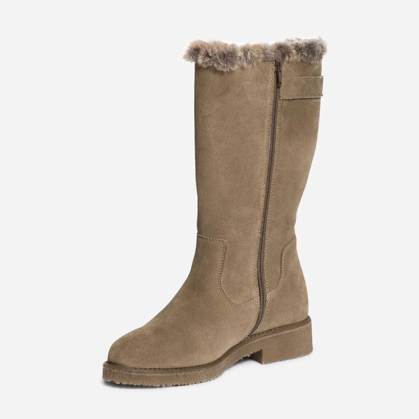 Mode plein hiver activé ! Revenez aux essentiels avec cette botte, qui s’adapte aux plus basses températures. En cuir velours taupe, elle est entièrement doublée de fourrure synthétique pour réchauffer les pieds et les tenues ! Le haut de la tige est souligné d’une bride, inspirée par le style motard. Un modèle à imaginer avec des tons neutres et chaleureux, blanc crème, gris perle, jaune safran.