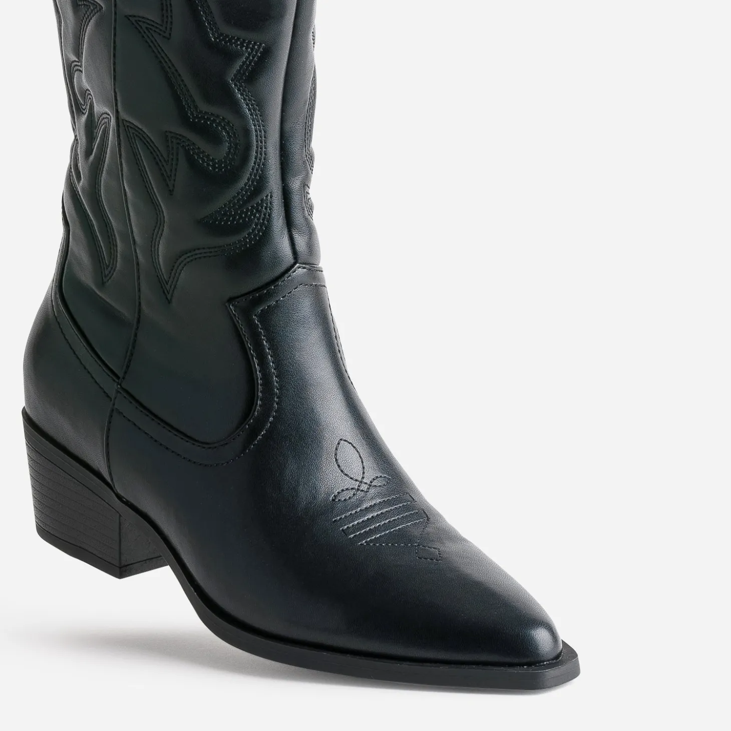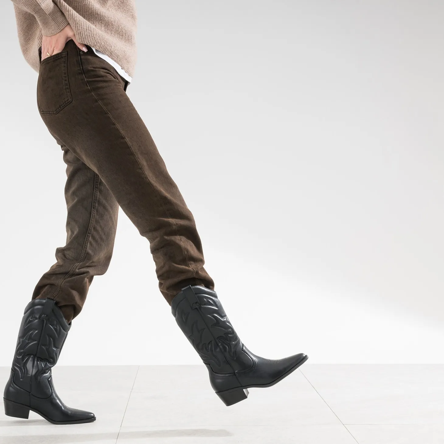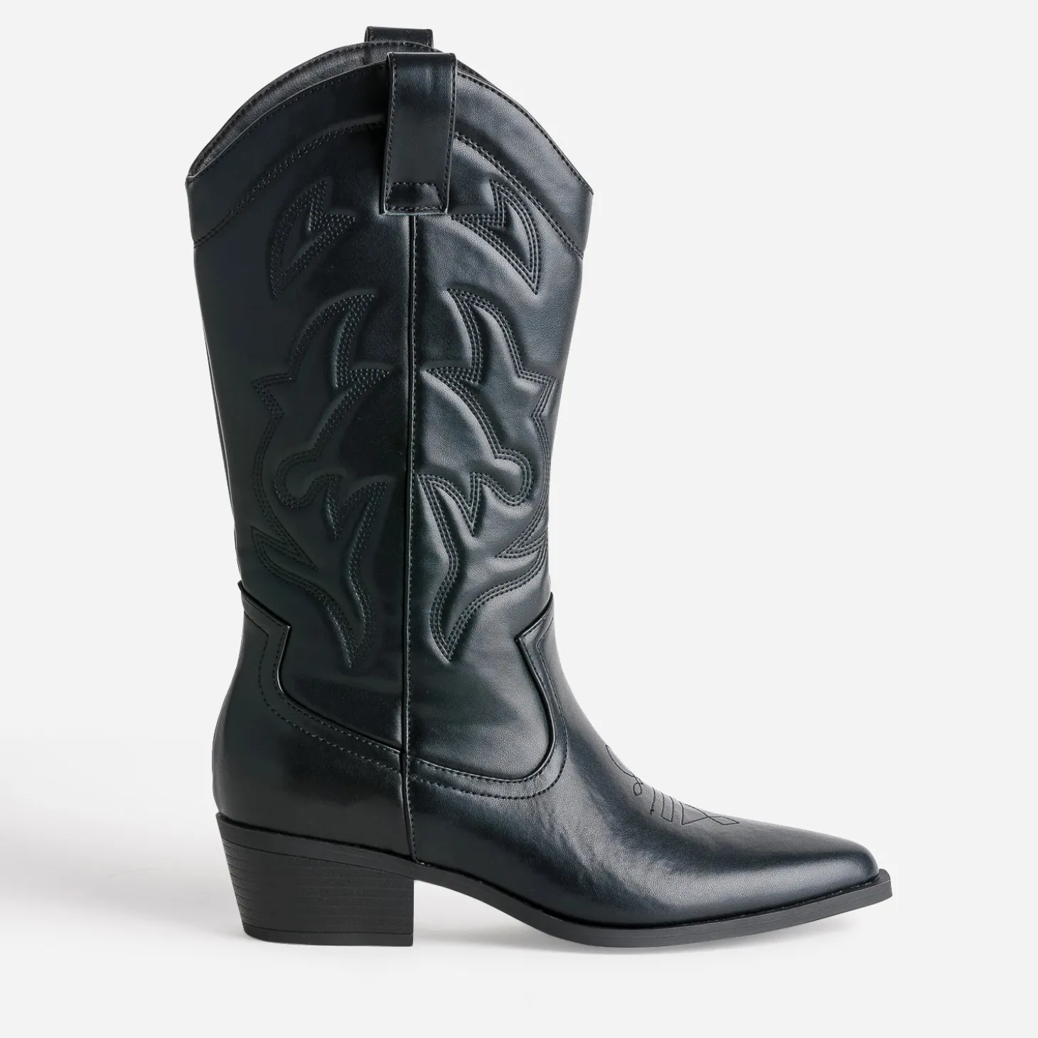 Rythmée de surpiqûres spécifiques, sur le dessus du pied et sur la tige, cette botte pour femme s’inspire clairement de la santiag. Bout pointu, talon bottier, elle s’enfile et se retire en une seconde. En matière synthétique lisse, elle s’autorise une déclinaison entièrement noire. Avec une chemise en jean, avec une jupe courte ou un slim, elle assure une touche rock, sans précédent.