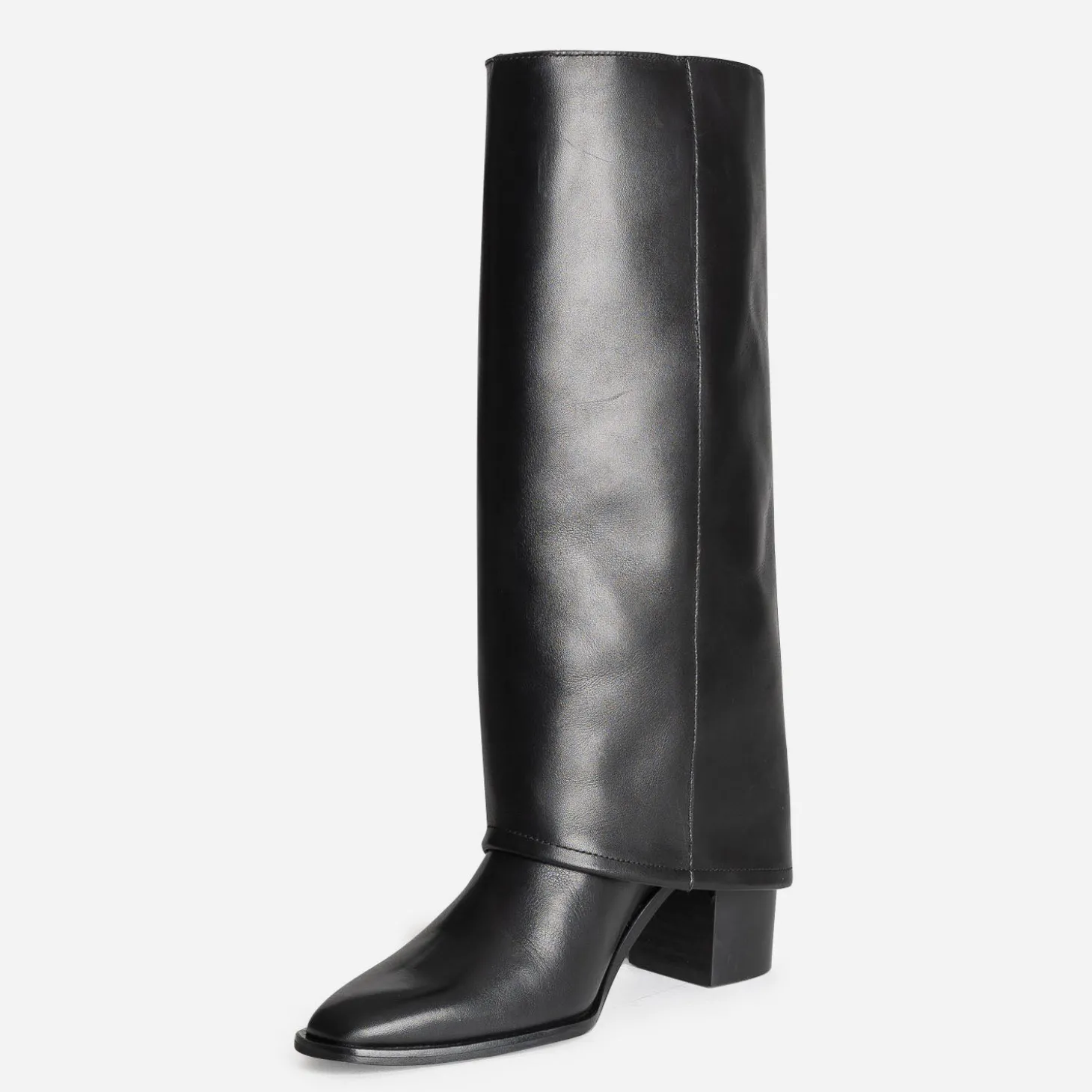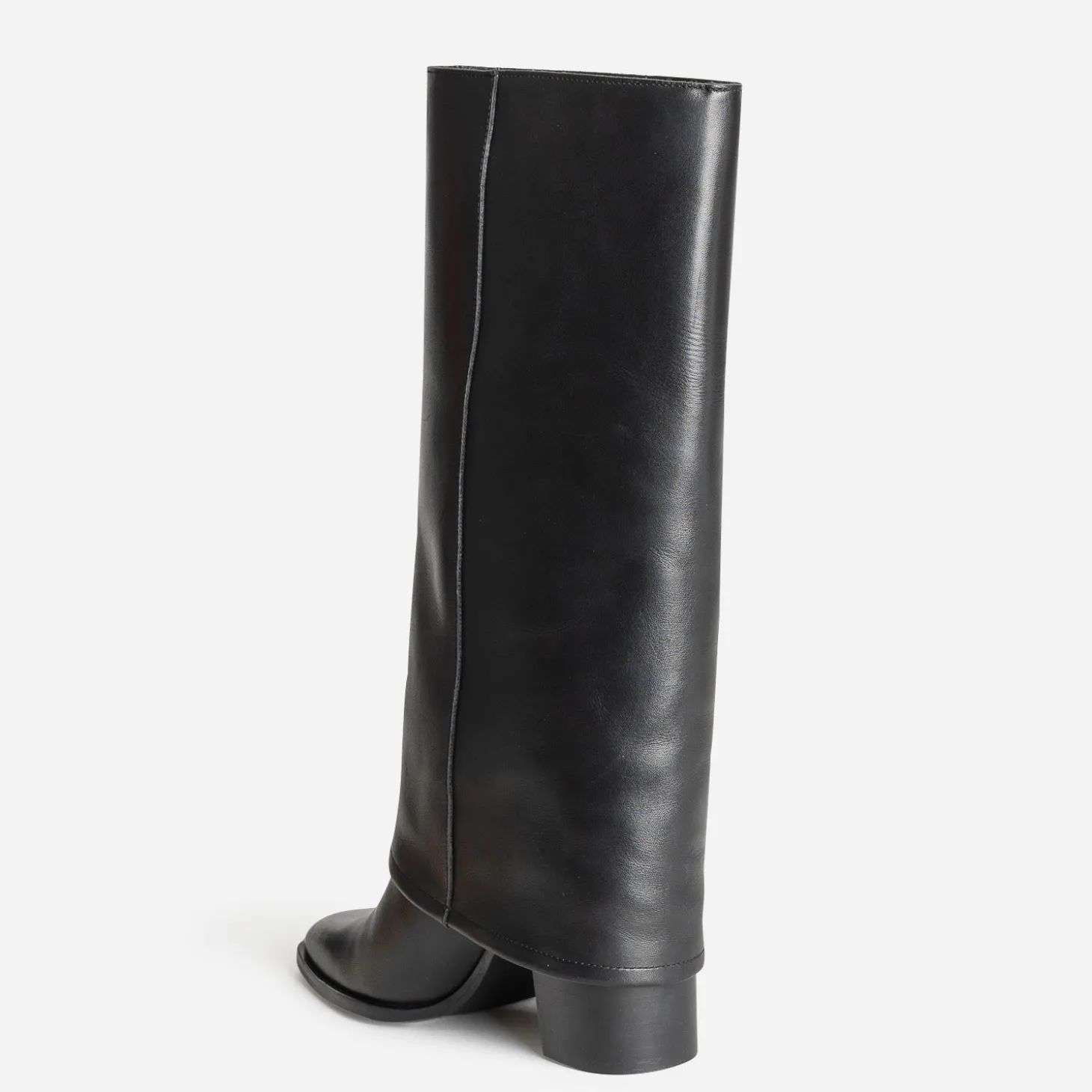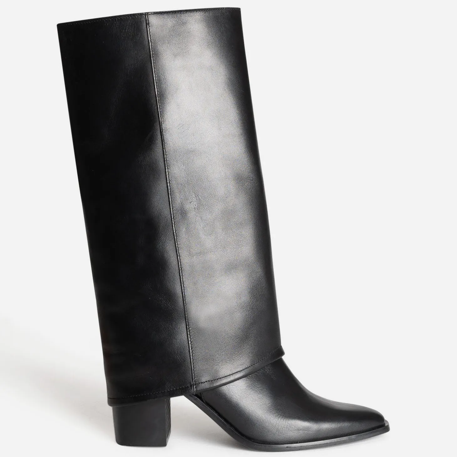 Reconnaissable à son large revers replié sur la tige, la botte fourreau s’autorise une version tout cuir, tout noir. Montée sur un talon de 7,5 cm, elle sublime le pied par un bout affiné. Un modèle ancré dans la tendance, idéal avec les robes et jupes longueur genoux de la saison.