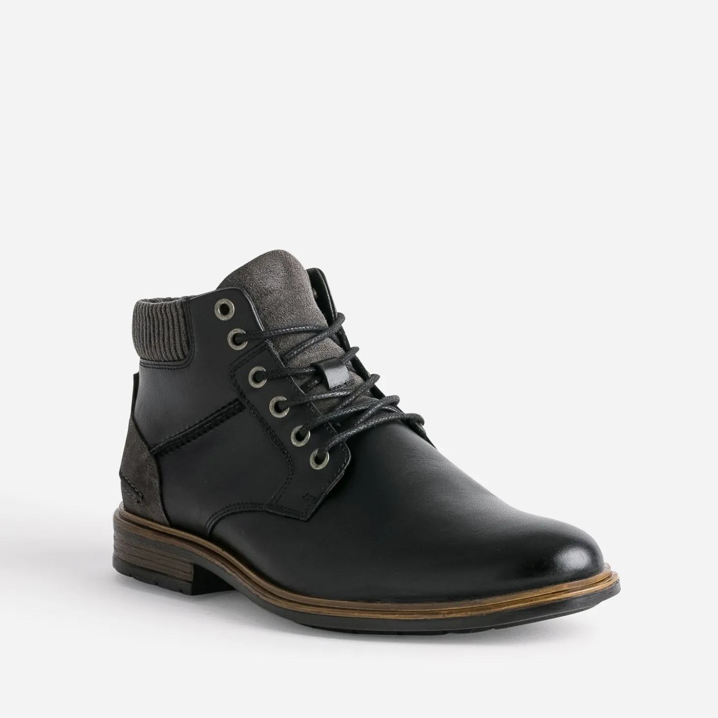 Cette bottine pour homme est un modèle idéal pour le quotidien. En cuir noir, elle est rehaussée d’empiècements en textile gris, sur le haut de la tige, le contrefort et la languette. La fermeture par lacet est renforcée par un zip intérieur, facilitant l’entrée et la sortie du pied. Pull camionneur gris, pantalon chino noir, elle s’adapte à un style casual, du lundi au dimanche.