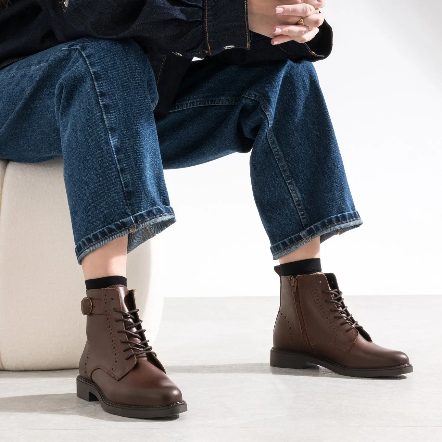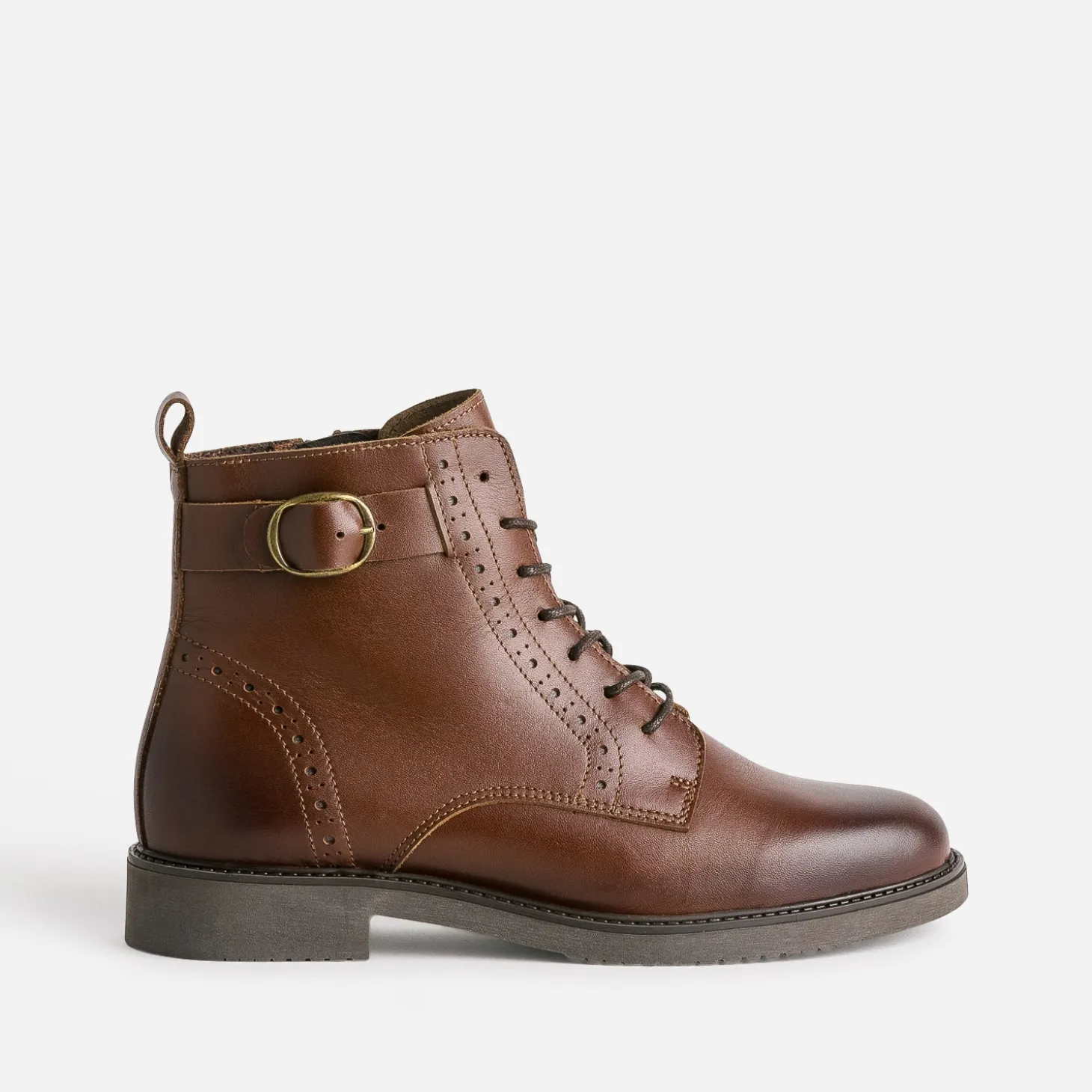 La saison est marquée par le retour du cuir en premier plan, à porter comme une seconde peau. La bottine n’y échappe pas ! En cuir lisse, elle opte pour un coloris cognac, intemporel, et des détails de perforations sur la patte de laçage et le contrefort. Le zip intérieur facilite l’entrée et la sortie du pied. Un modèle à privilégier avec un blouson aviateur, un pull chaussettes, une jupe midi en cuir et des chaussettes hautes.