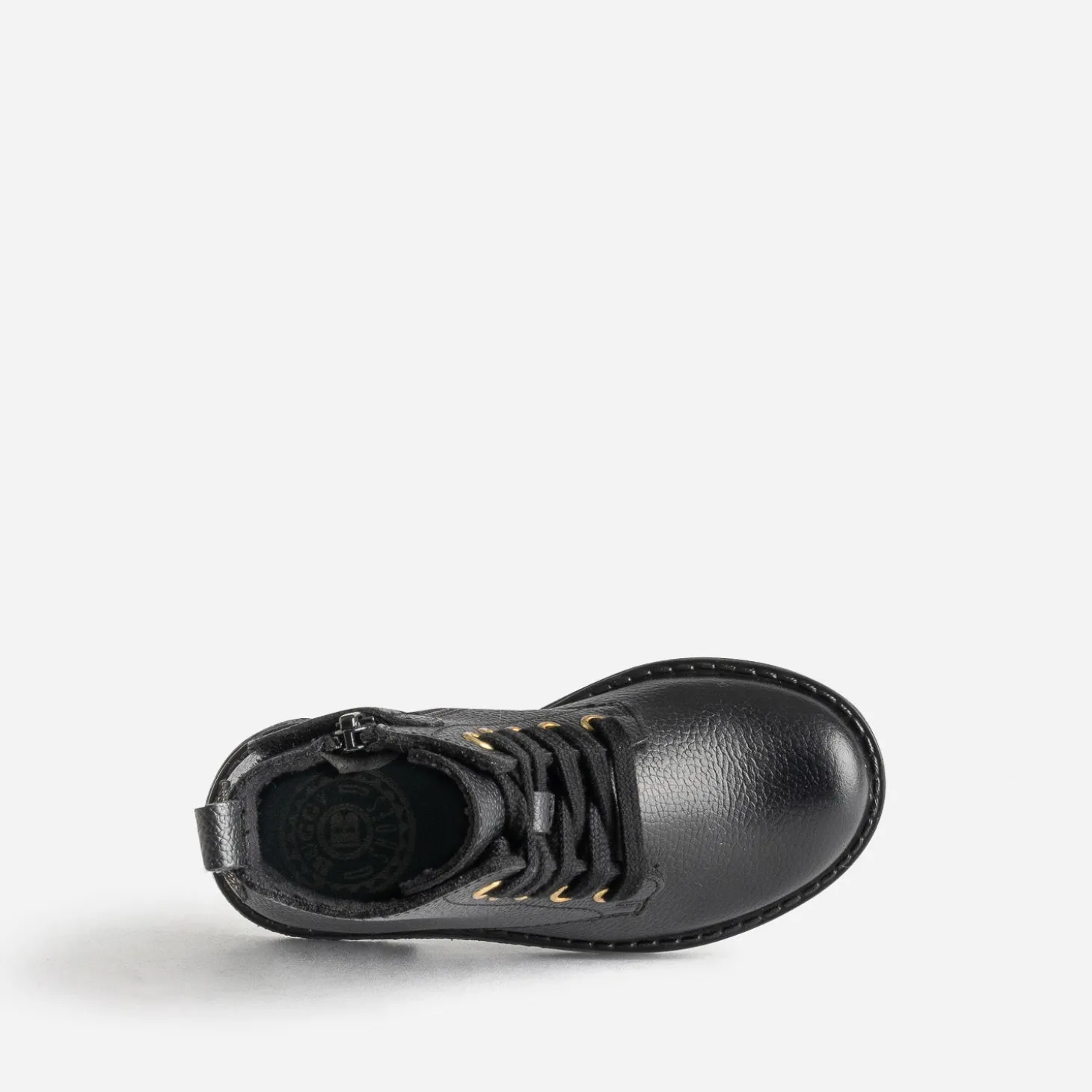 Confectionnée en cuir noir, cette bottine pour fille s’accorde aussi bien avec une robe en tulle noire qu’avec un pull et un jean slim. Un esprit rock renforcé par l’étoile dorée, posée sur le contrefort. Laçage, zip extérieur et scratch contribuent à maintenir le pied.