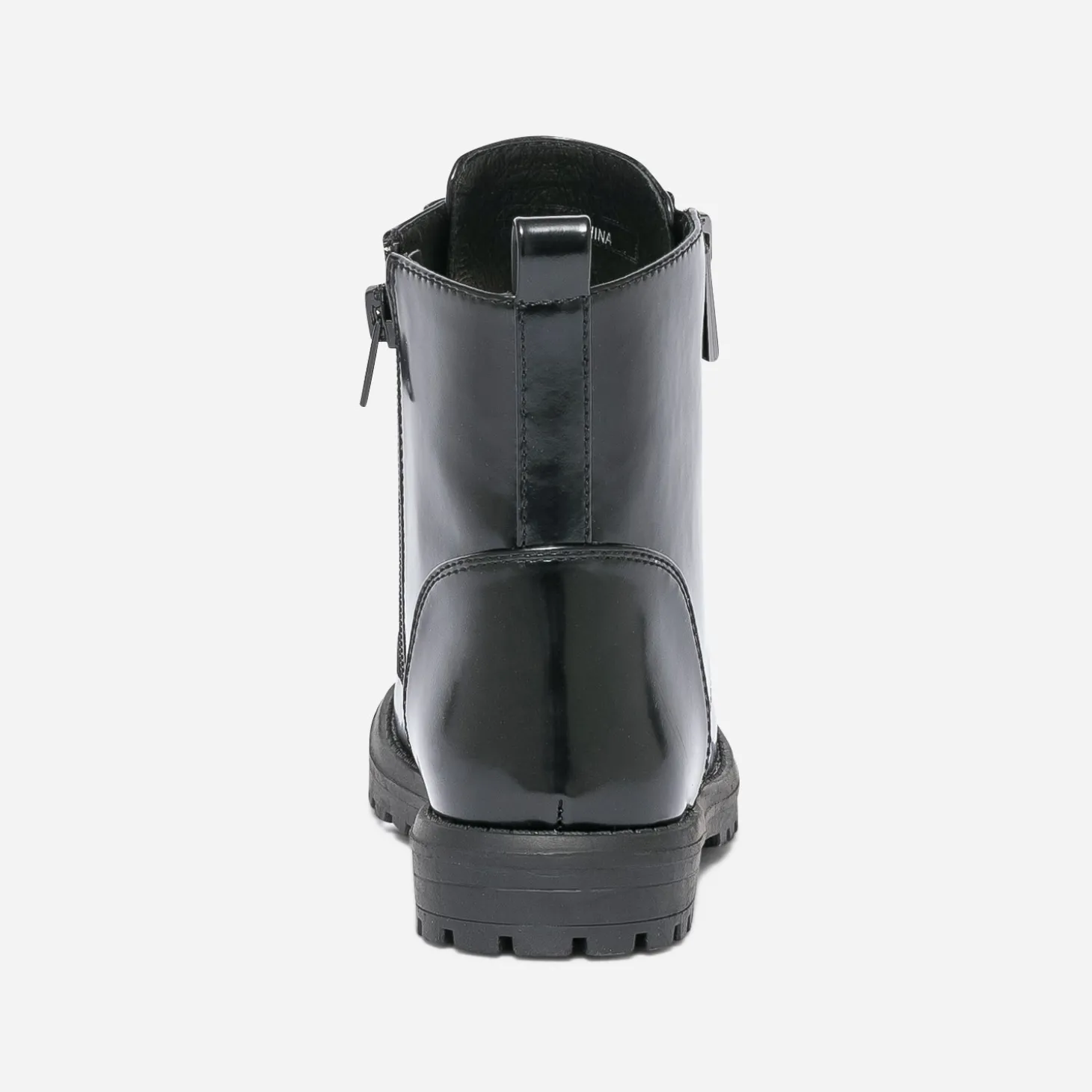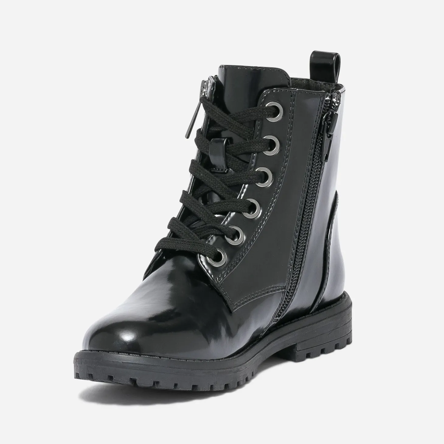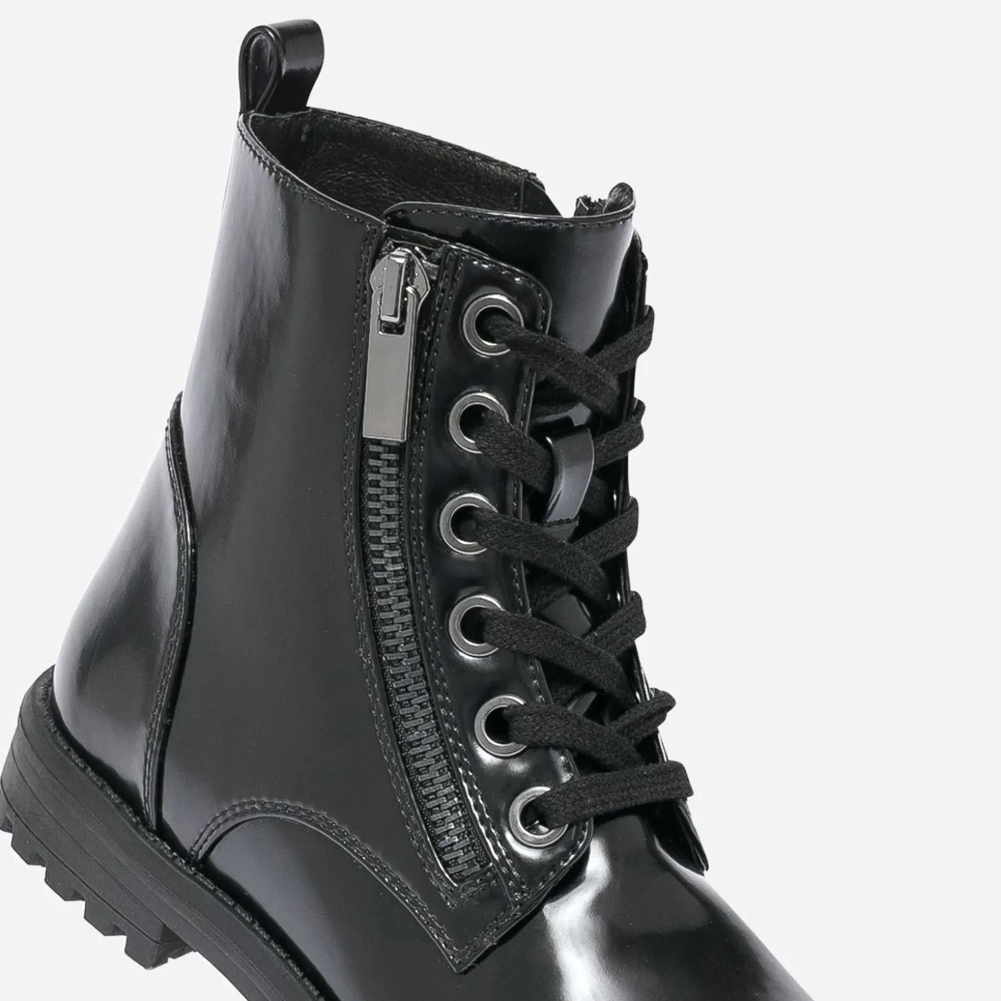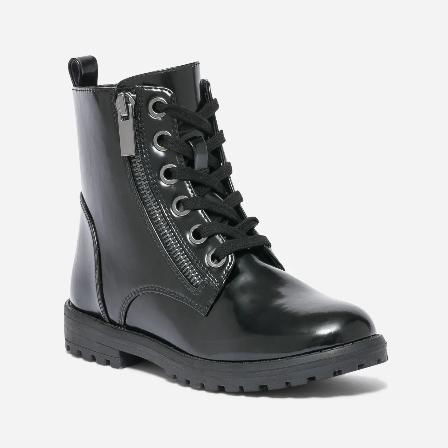 Elle revient chaque automne, chaque hiver, sans qu’on puisse s’en lasser. La bottine chausse les filles qui aime avoir le pied bien maintenu, allié à un style rock bienvenu. En matière synthétique bordeaux, avec finition glacée, elle est montée sur une semelle crantée et présente un zip décoratif sur le côté. En outre, lacet ou zip latéral permettent de faciliter l’entrée et la sortie du pied. Qu’elle soit en jean ou en robe, ce modèle finalise toutes ses tenues avec un goût sûr.