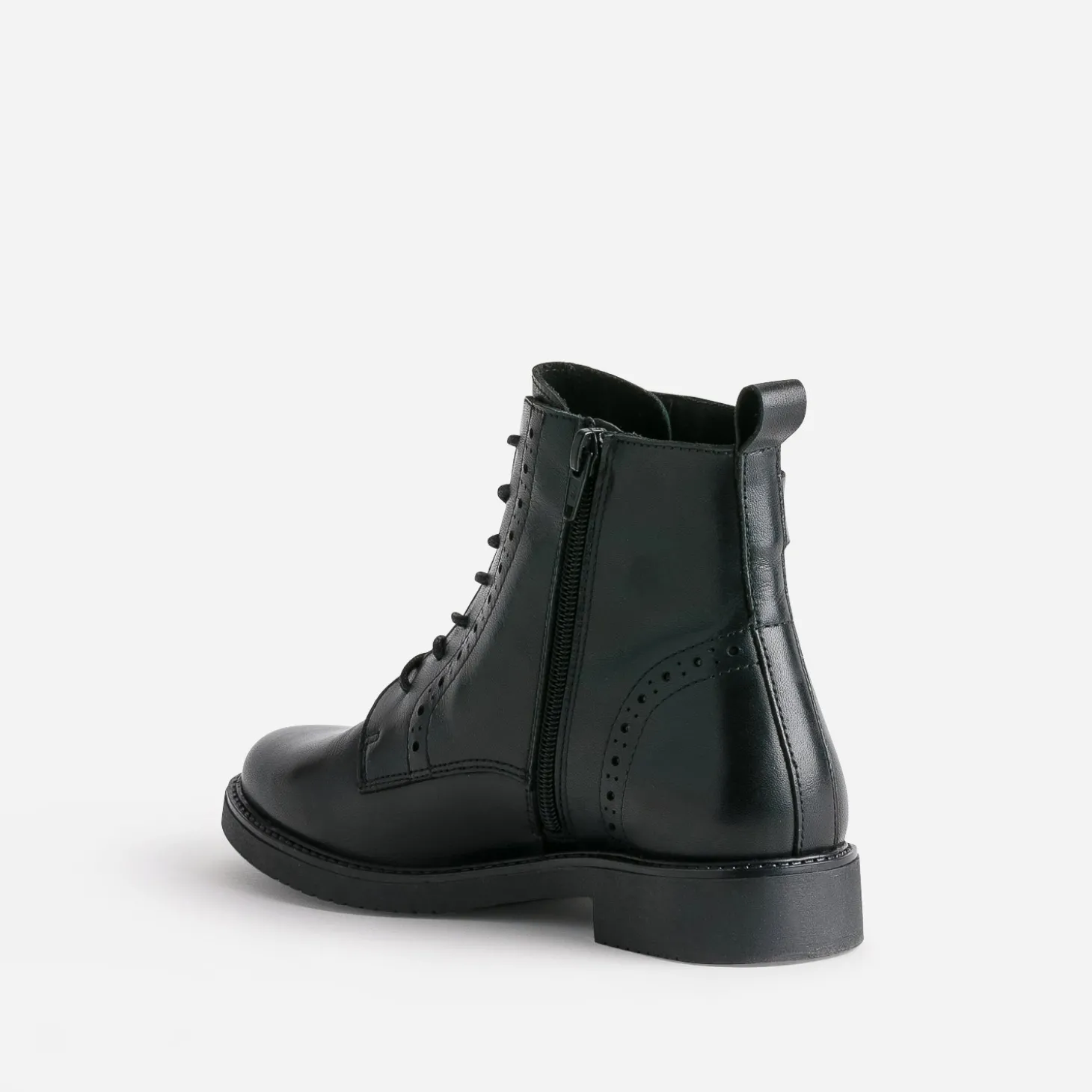 La saison est marquée par le retour du cuir en premier plan, à porter comme une seconde peau. La bottine n’y échappe pas ! En cuir lisse, elle opte pour un coloris noir, intemporel, et des détails de perforations sur la patte de laçage et le contrefort. Le zip intérieur facilite l’entrée et la sortie du pied. Un modèle à privilégier avec un blouson aviateur, un pull chaussettes, une jupe midi en cuir et des chaussettes hautes.