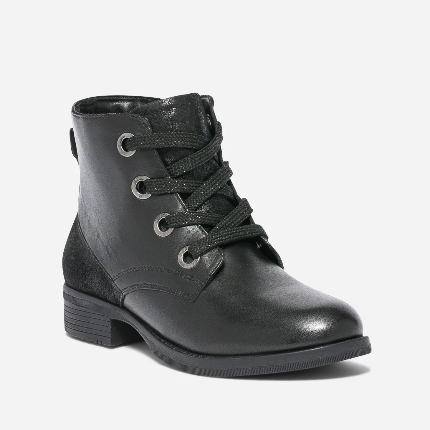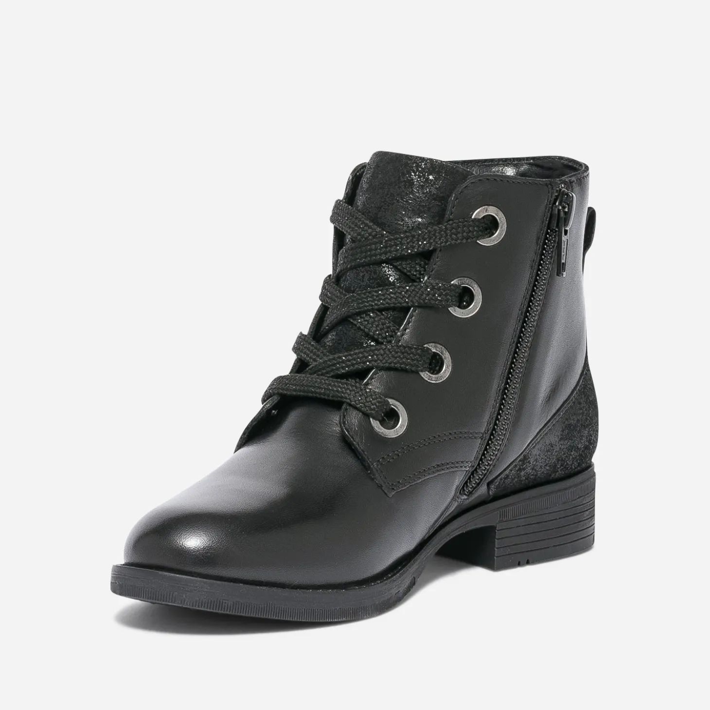 Rock ou militaire, ou même preppy, la bottine pour fille a le pouvoir fou de s’adapter à beaucoup de styles. Conçue en cuir noir, elle présente un empiècement en cuir velours sur la languette et le contrefort et se ferme par un lacet pailleté et un zip intérieur, pour faciliter l’autonomie des plus petites. Avec un perfecto, une combi-pantalon ou une robe en tulle, elle voudra les mettre à ses pieds tous les jours.