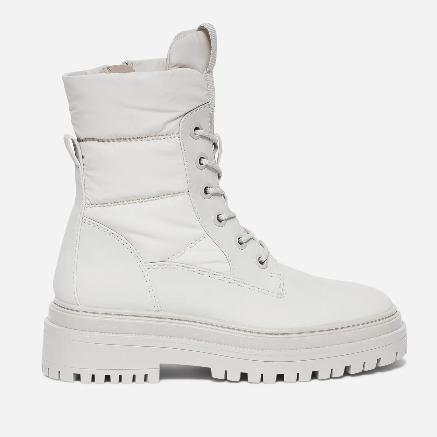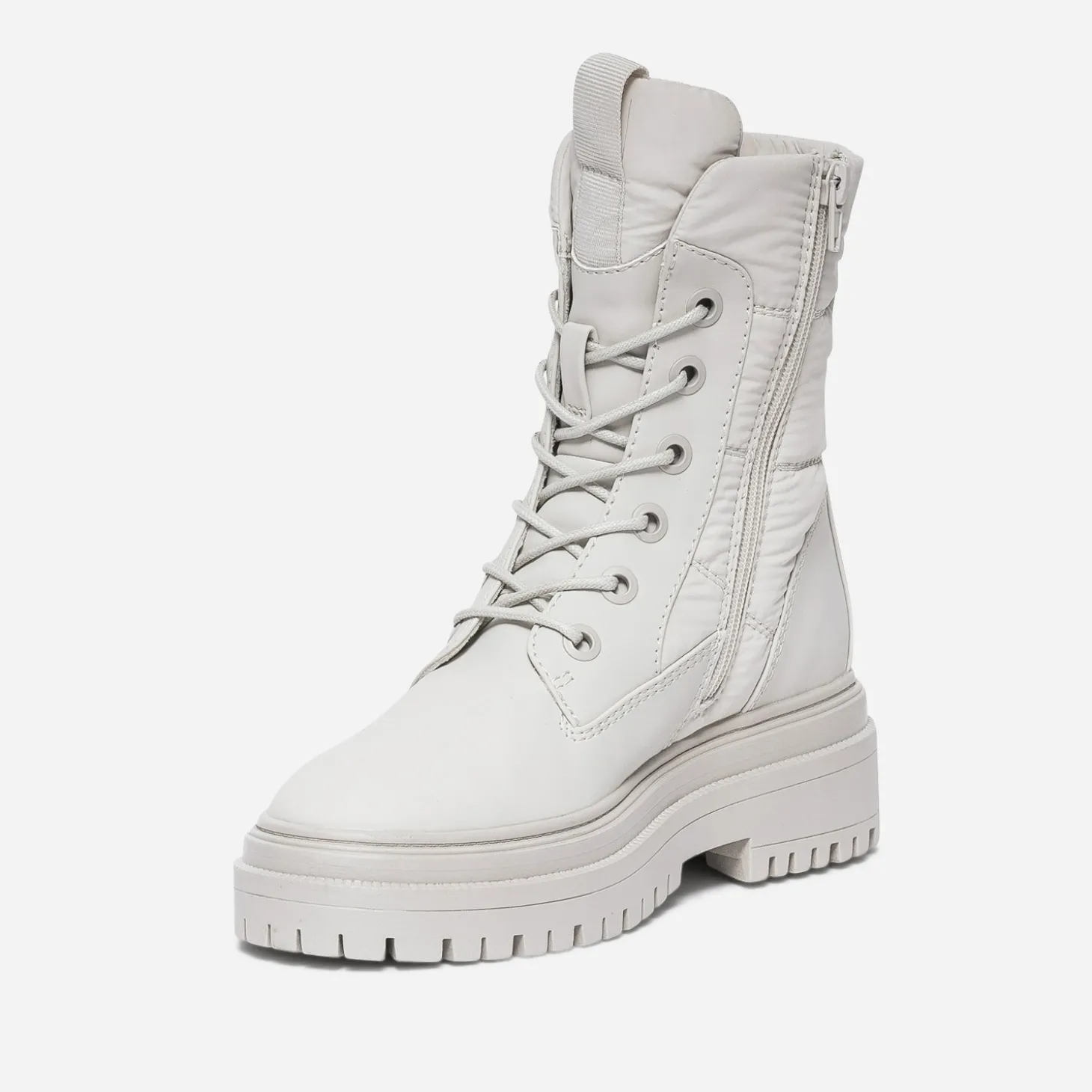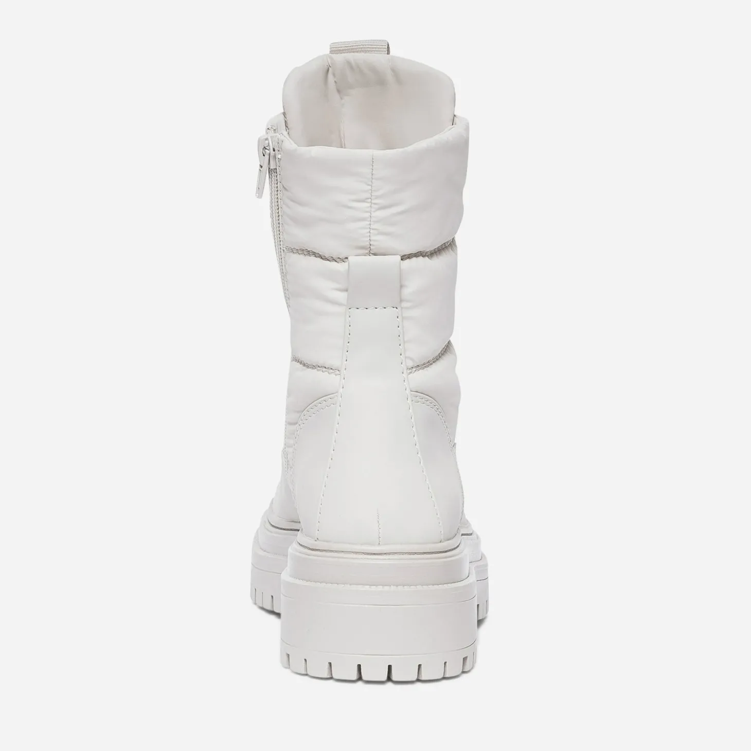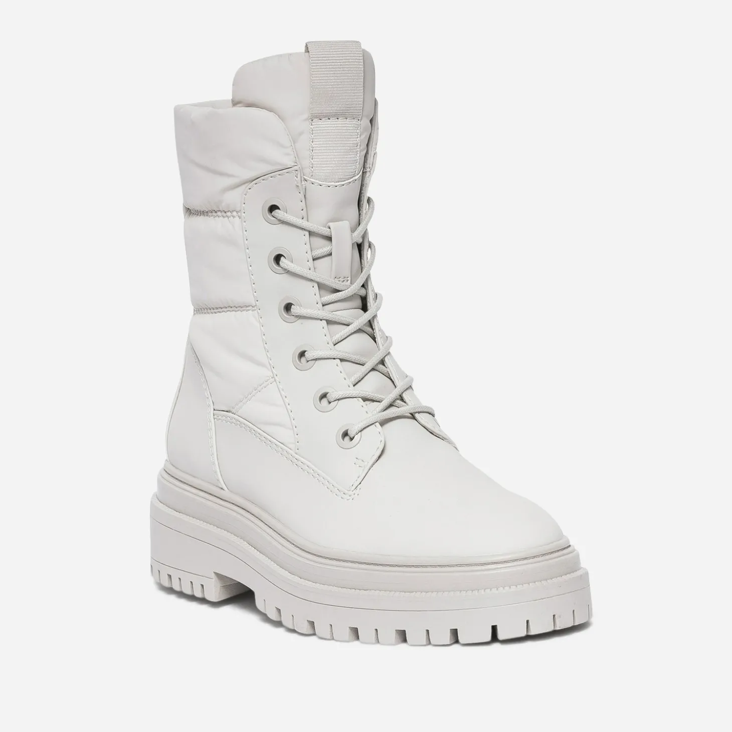 N’attendez pas que le trottoir soit recouvert de neige, pour adapter votre façon de marcher. Cette bottine femme est pensée pour l’hiver et ses variations imprévisibles de températures et de météo. En matière synthétique beige clair, elle défend un style monochrome, depuis la tige jusqu’à la semelle crantée, en passant par le lacet. La tige bi matière, avec un empiècement en nylon matelassé, fait écho à l’incontournable doudoune de saison. Volume oversize pour le haut, coupe ajustée en bas, essayez le total look dans des teintes naturels.