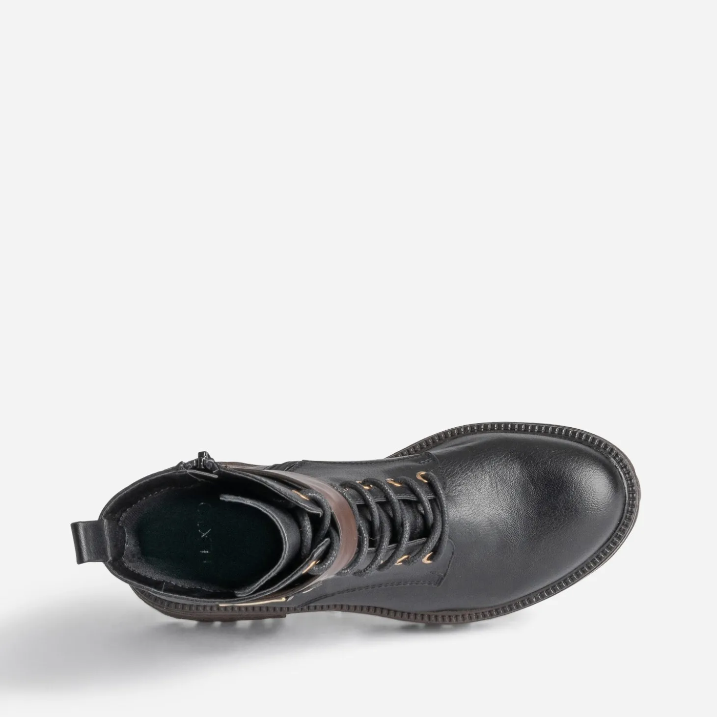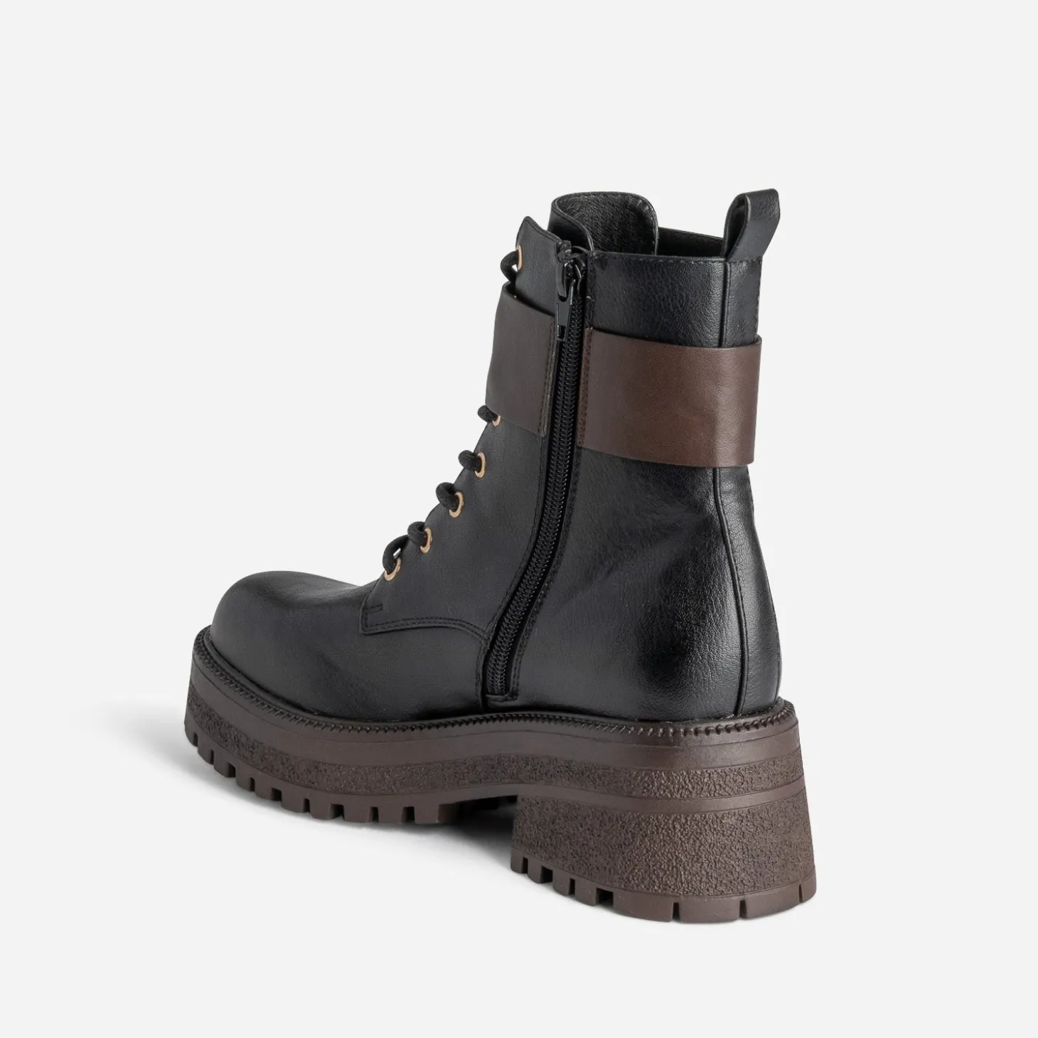 Tige haute avec patte décorative, semelle crantée et fermeture par lacet : une inspiration militaire évidente pour la bottine phare de la saison. En matière synthétique, elle ose un duo de noir et de marron, parfaitement équilibrée. La semelle épaisse vous fera gagner 6 cm sans efforts. Un modèle à associer avec un look masculin-féminin dans les mêmes tons.