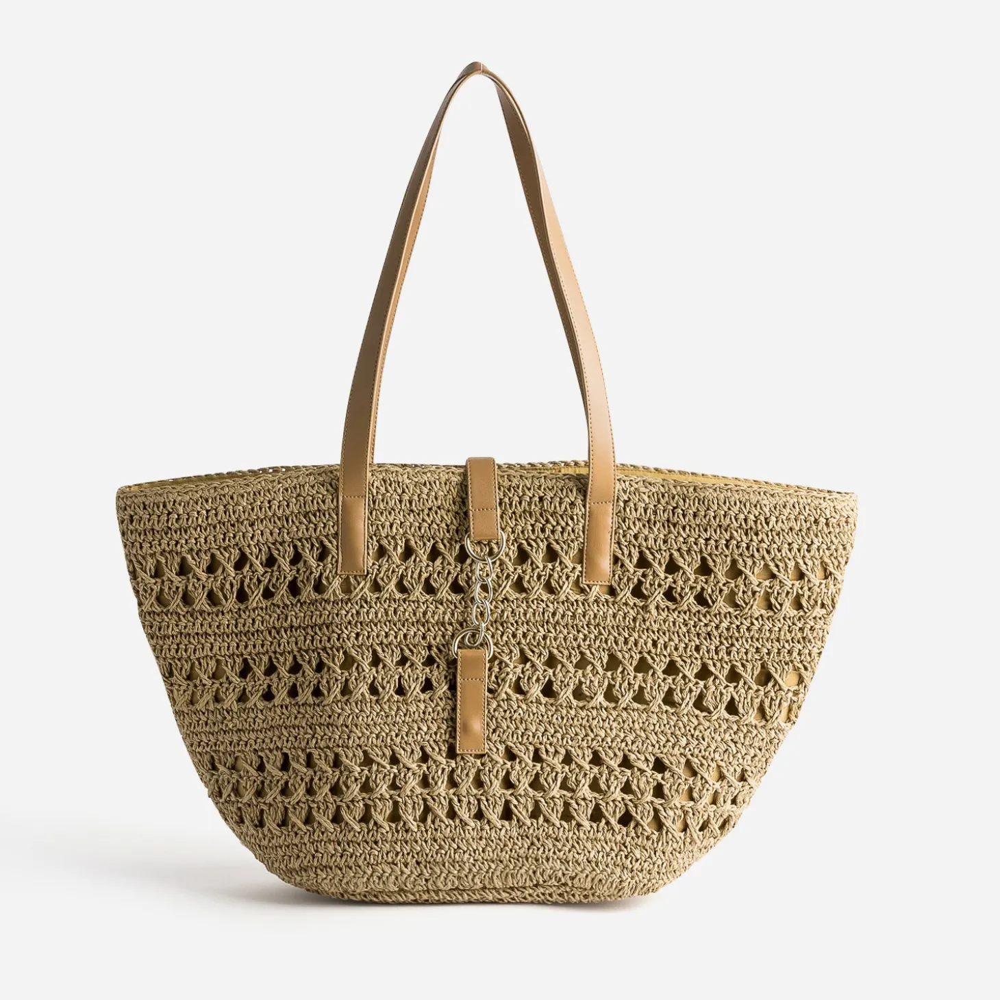 Jamais trop grand, le cabas s’impose dans le dressing d’été, dans une version raphia, avec tressage ajouré. Beige foncé, il est doublé de textile ton sur ton, rehaussé par des touches en matière synthétique camel, sur les anses pour un porté épaules et une patte-bijou en fermeture. Un véritable it-bag, du bureau jusqu’à la plage, avec des pièces en lin ou des robes longues vaporeuses.