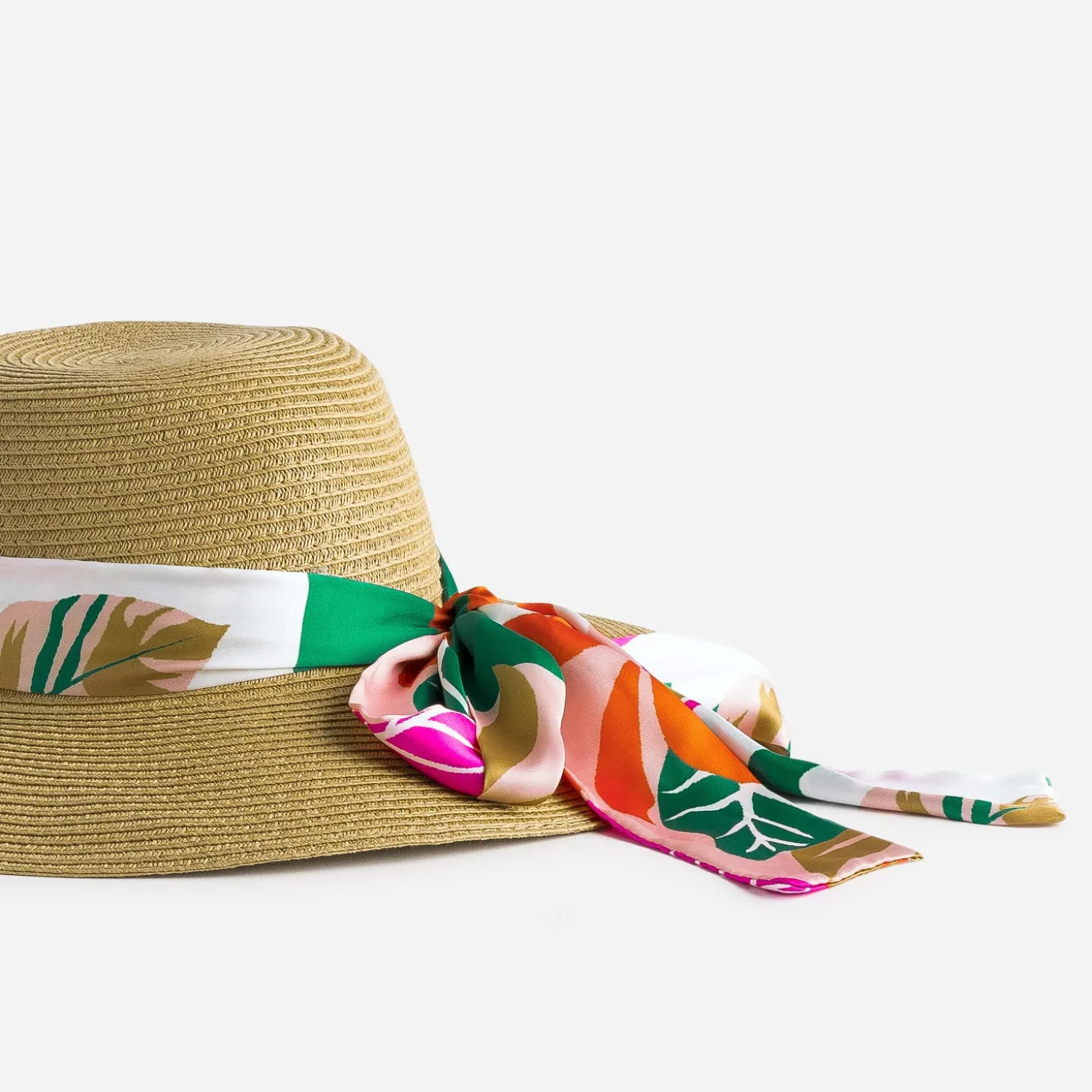 L’accessoire indispensable dès l’arrivée de beaux jours, c’est le chapeau. Inspiré par la capeline, il coiffe les femmes en quête d’un style bohème chic. En 100% papier beige, il est souligné d’un ruban fixe à motif végétal, dans des teintes printanières. Un accessoire à imaginer sur un costume-short ou une robe, dans les tons vert vif.