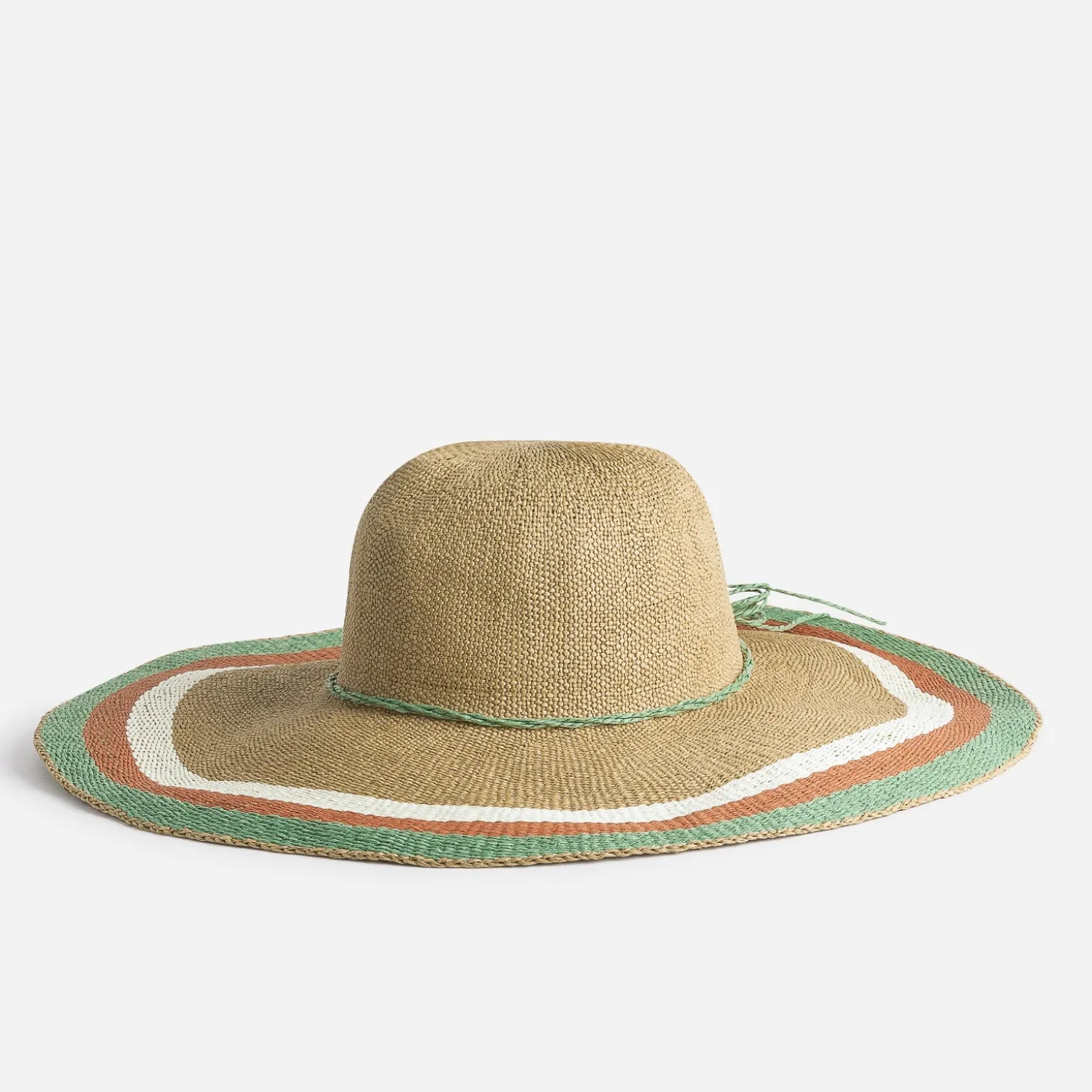 Bordée de trois rayures vert sauge, terracotta et écrue, soulignée d’un lacet vert, cette capeline beige est l’accessoire star des beaux jours. Confectionnée en papier, elle est à la fois légère, fonctionnelle et stylée.
