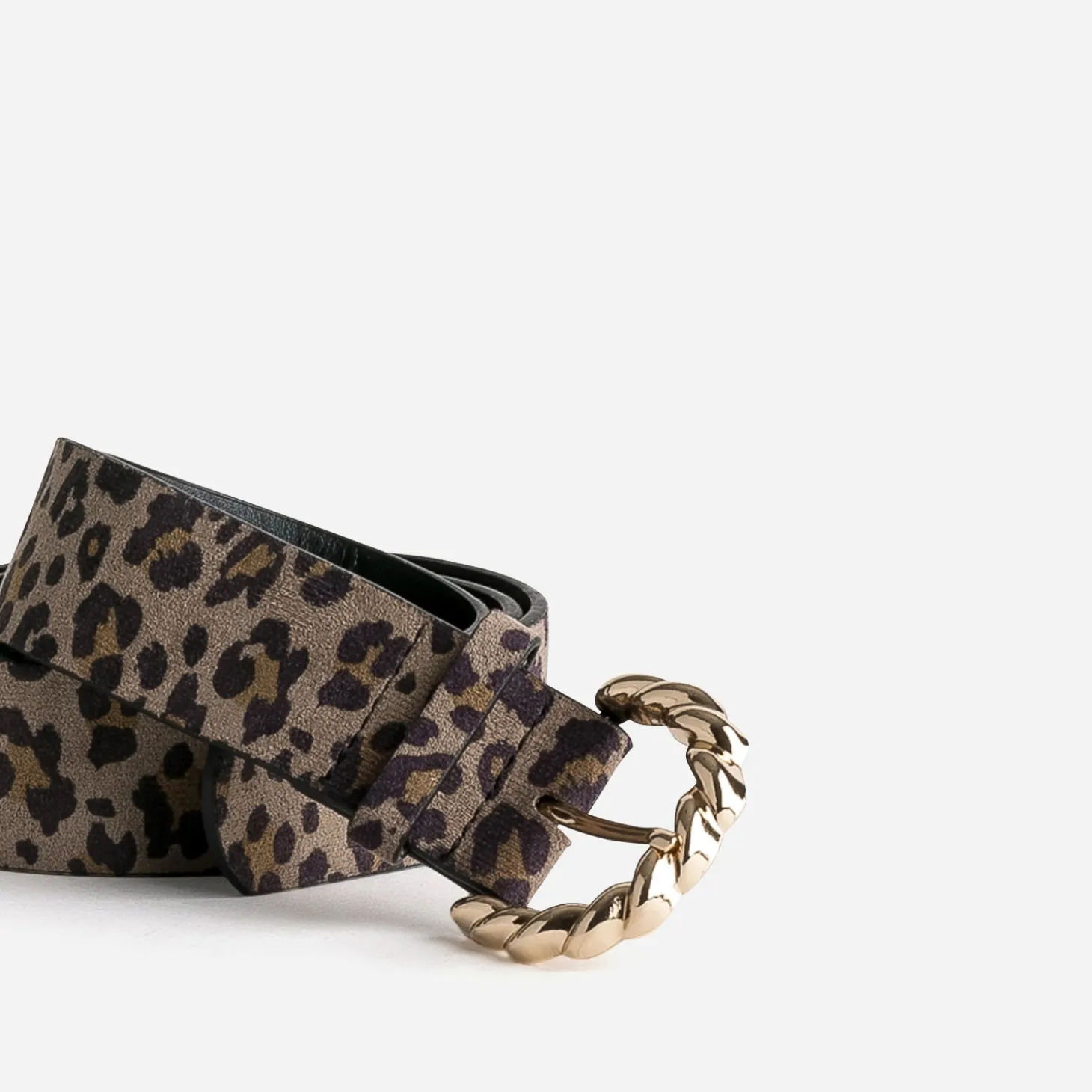 Le motif léopard ? On ne parle que-de-lui ! Il envahit les pages des magazines de mode et, par répercussion, votre dressing. Apprivoisez-le avec une ceinture. En matière suédée, elle se décline dans les tons taupe, marron et camel, et se finalise par une boucle fantaisie en métal jaune. Un accessoire à privilégier avec un pantalon noir et en haut, un pull de couleur rouge vif.