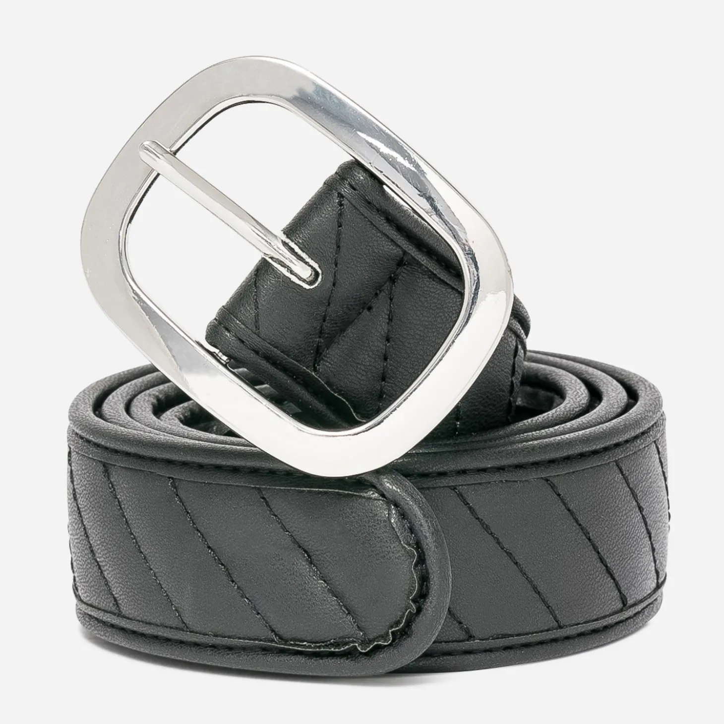 La tendance autour du matelassé n’en finit pas de faire parler. Après la veste ou le sac, la ceinture, aussi, se laisse tenter par un relooking mode. En matière synthétique noire, elle est rythmée d’un jeu de surpiqûres régulier, qui apporte cet effet gonflant recherché. Elle se ferme par une maxi boucle en métal blanc. Sur une robe patineuse, sur une doudoune, transformez l’essai.
