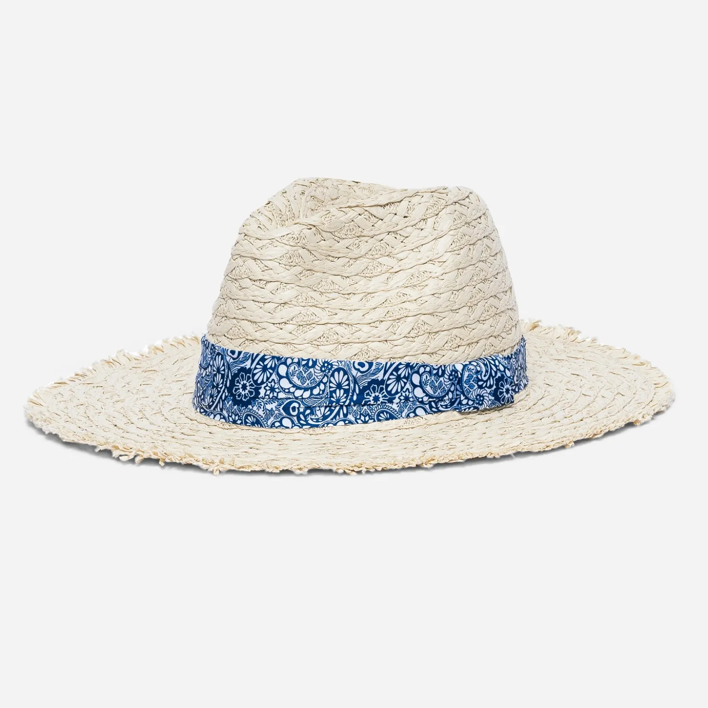 Ce chapeau coiffe les femmes en quête de style, même en été, surtout en vacances. 100% paille beige, il est souligné d’un large galon bleu marine et blanc, à imprimé cachemire. A associer avec des pièces en jean bleu ou blanc.