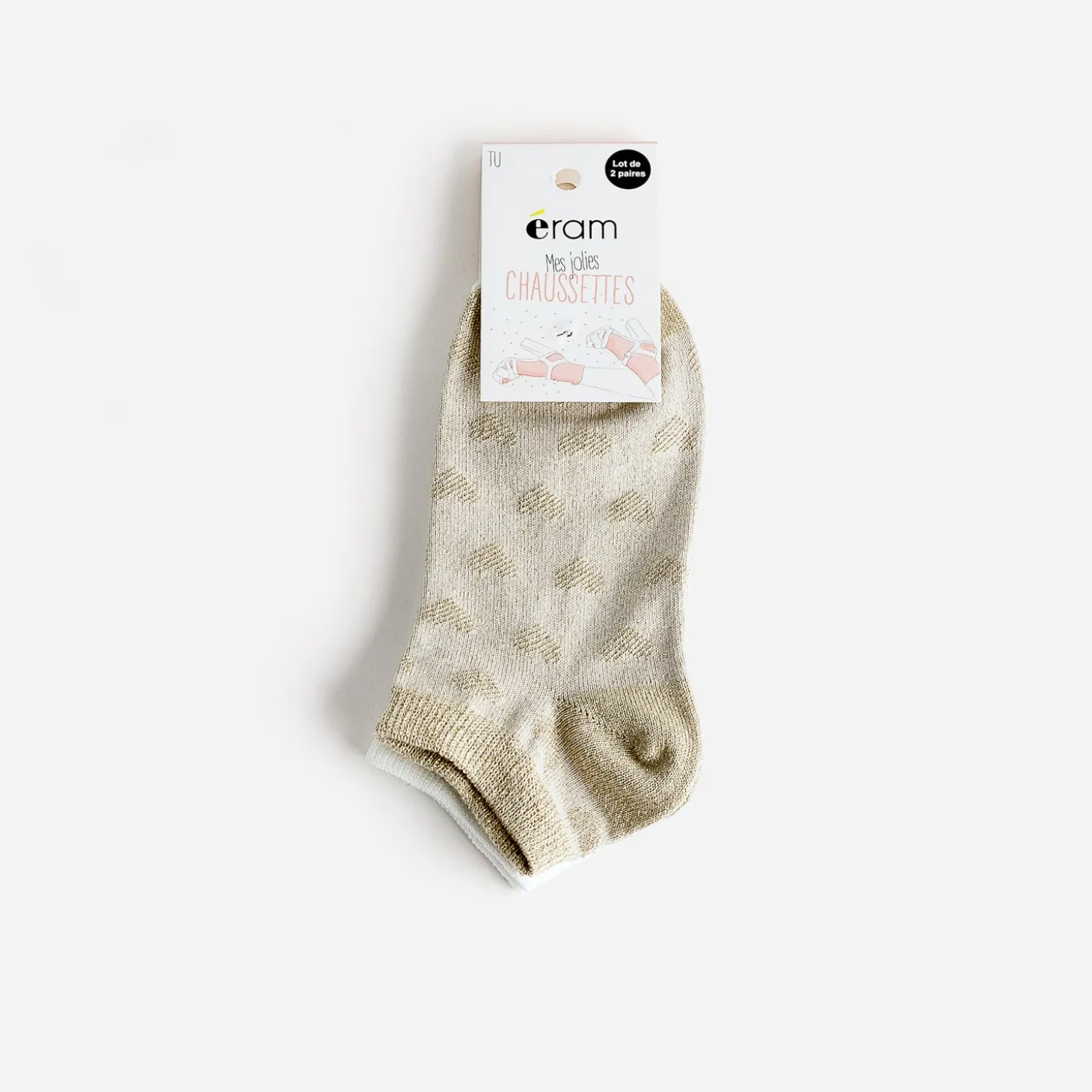 Ces chaussettes courtes pour junior fille sont disponibles en lot. D’une part, une paire beige doré, jacquard à motifs cœurs et d’autre part, une paire écrue unie. Toutes deux sont idéales pour mettre en valeur les jambes hâlées de l’été.