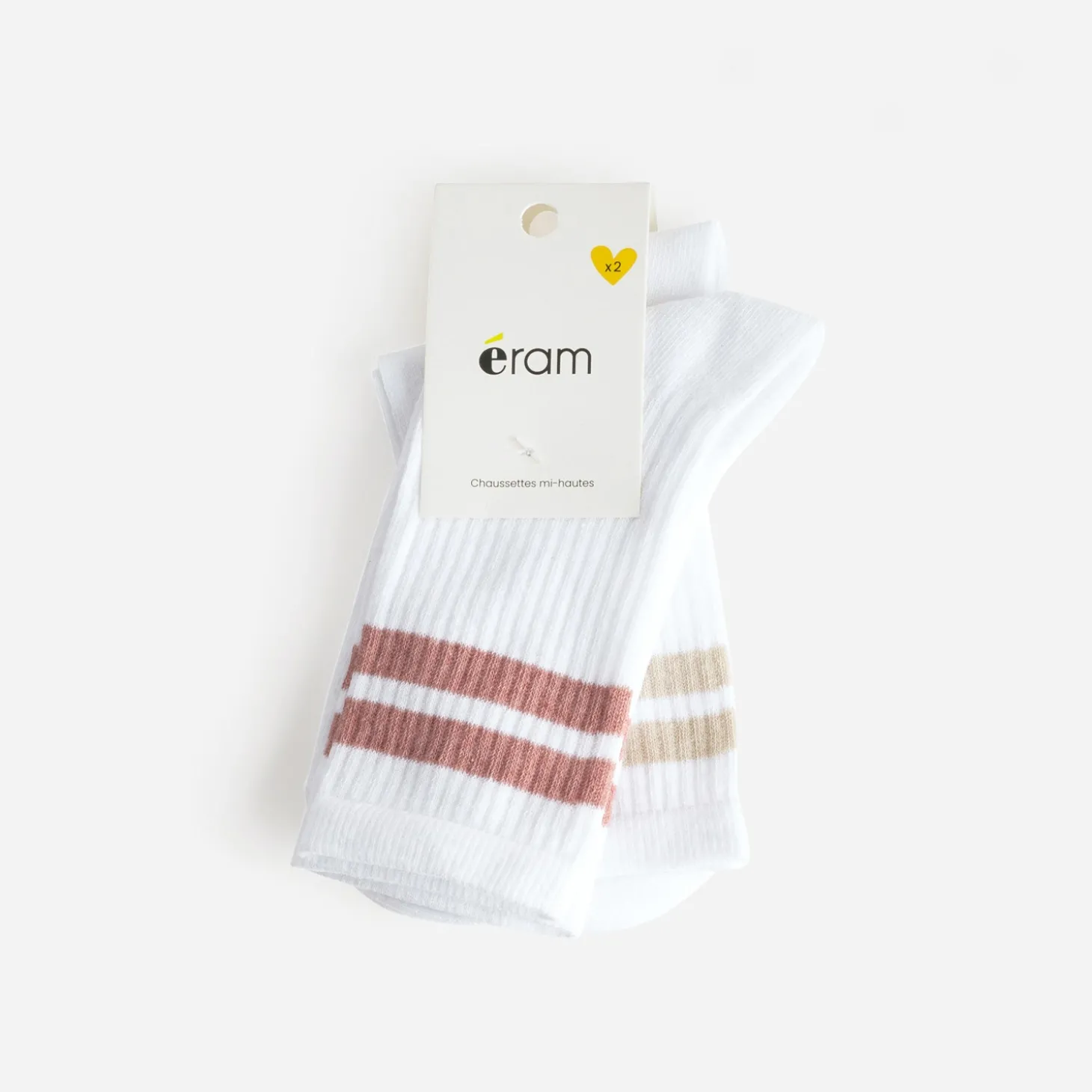 La tendance est à la chaussette de sport, portée haute sur le mollet. Blanches et côtelées, ces deux paires se démarquent par des rayures beiges pour l’une, par des rayures vieux rose pour l’autre. Des modèles à privilégier avec des tennis basses ou montantes, et une tenue décontractée.