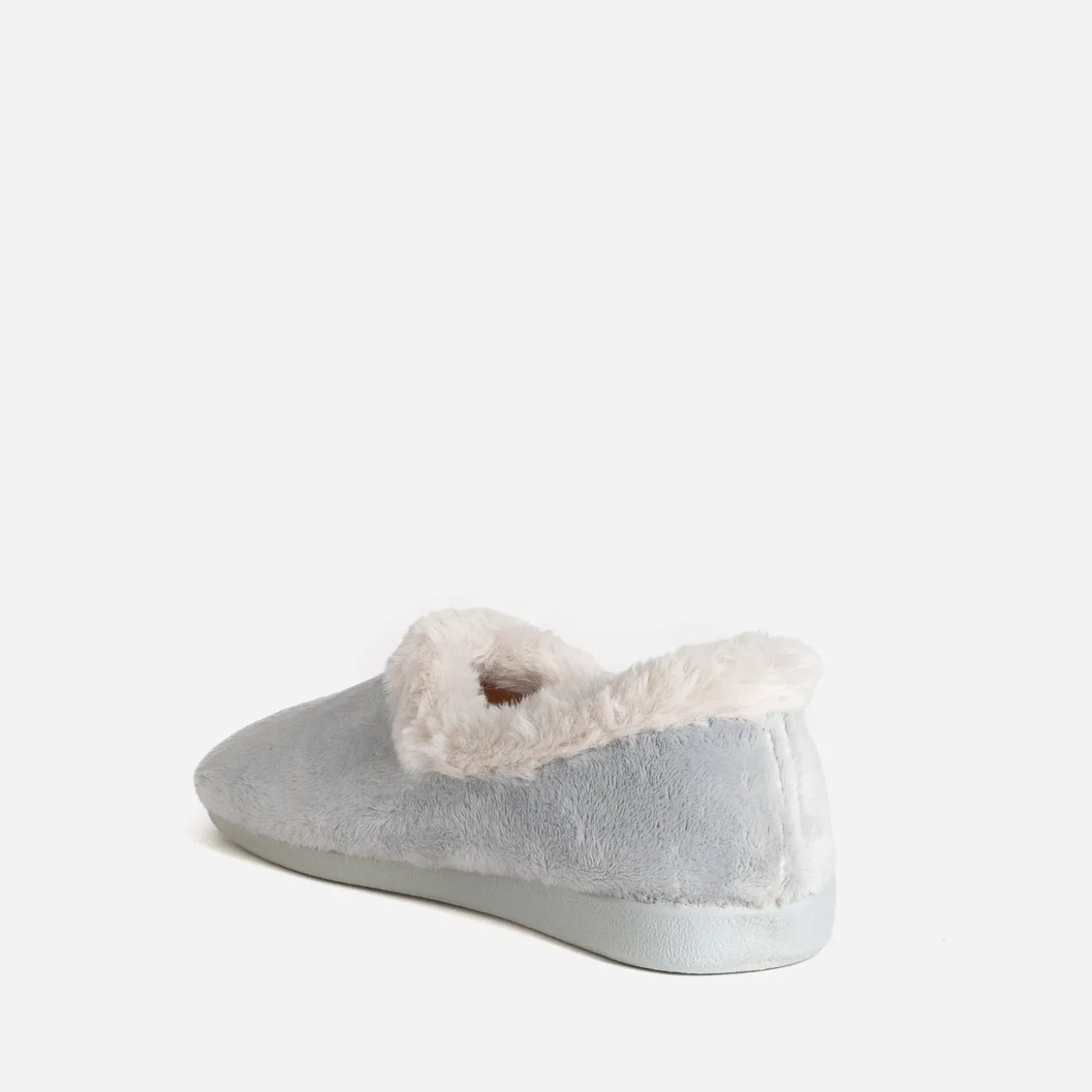 Quel bonheur de glisser ses pieds dans des chaussons, après une longue journée ! En textile tout doux, gris sur le dessus, beige à l’intérieur, blanc sur le bord, il est monté sur une semelle rigide. Un modèle comme une invitation au mode cocooning.