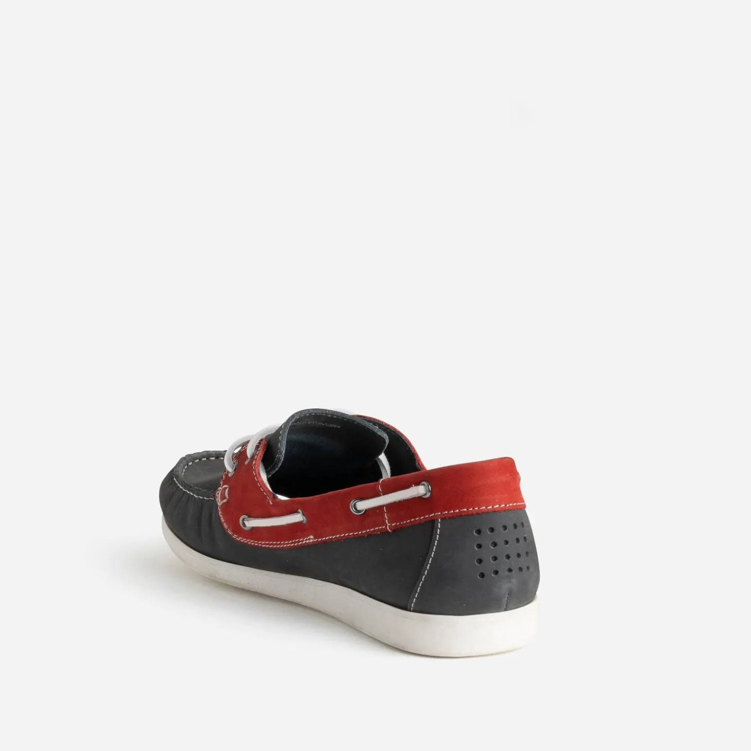 Modèle emblématique et indémodable, la chaussure-bateau chausse les hommes en quête d’un style casual. En cuir nubuck bleu marine, elle est rehaussée de quartiers rouge foncé, soulignée de surpiqûres et de lacets en cuir blanc. Intemporelle, elle est l’alliée des marinières et des bermudas battle.
