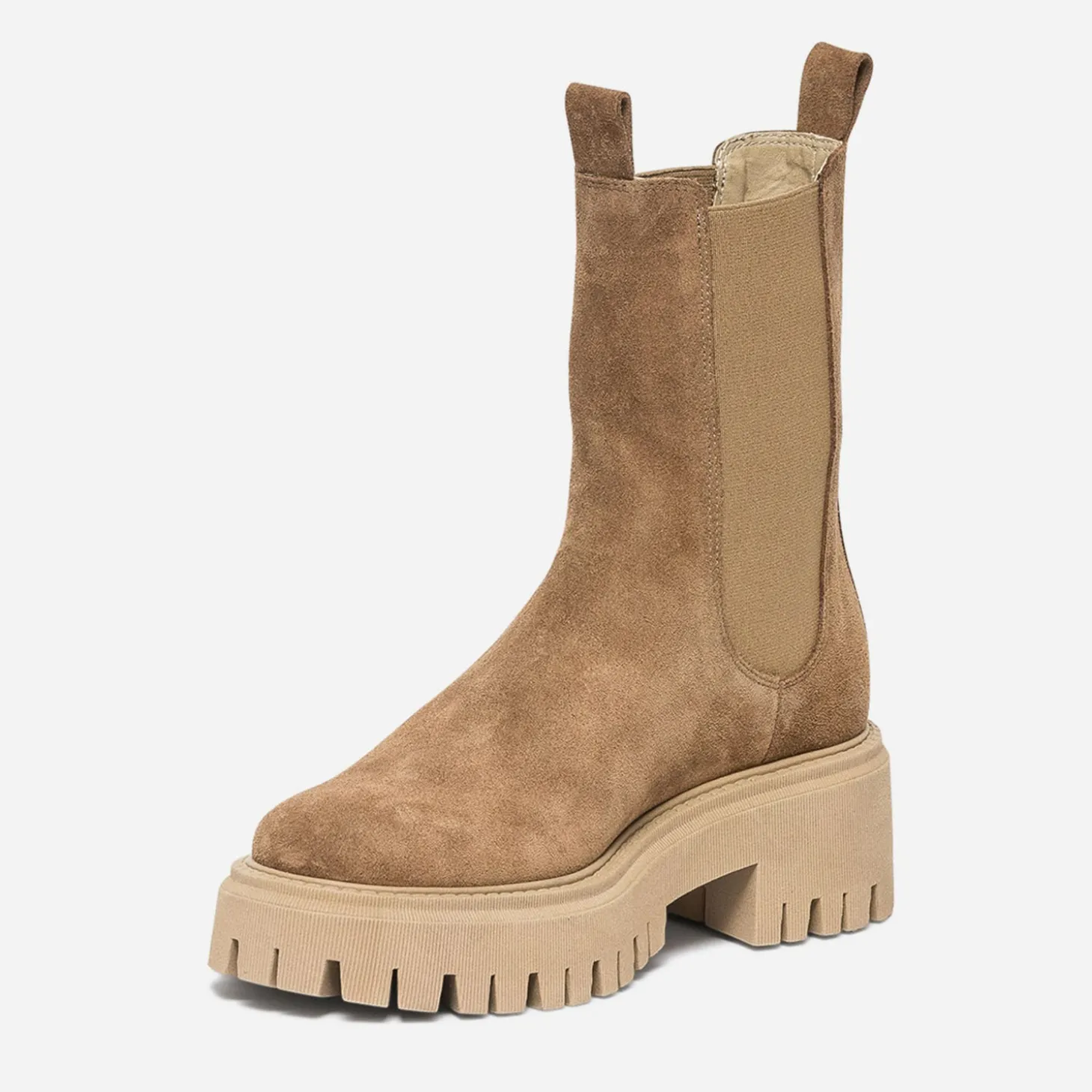 Levons les doutes. Pour avancer coûte que coûte, la chaussure doit être adaptée. Maxi semelle crantée et tige plus haute, ce Chelsea boots, en cuir velours camel, reste votre meilleur allié. Jouez-le avec une allure néo-punk ou school girl, toutes deux en tête des tendances, cette saison.